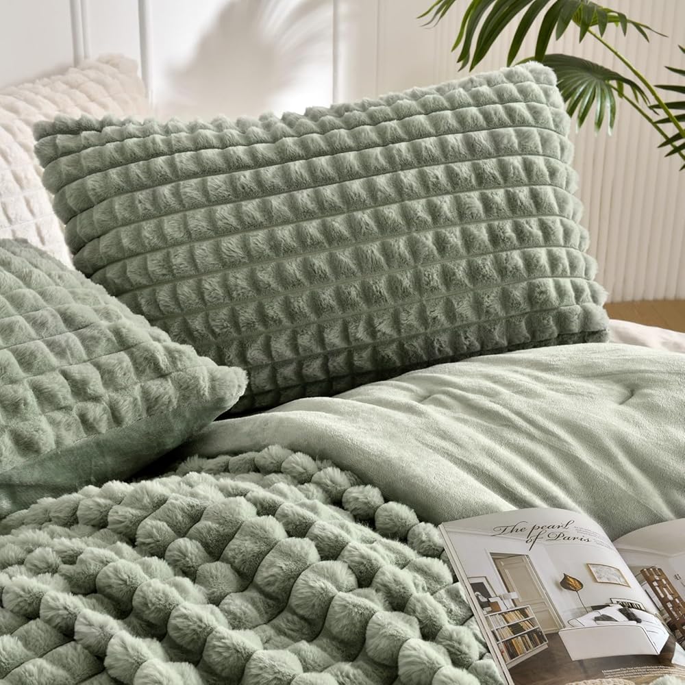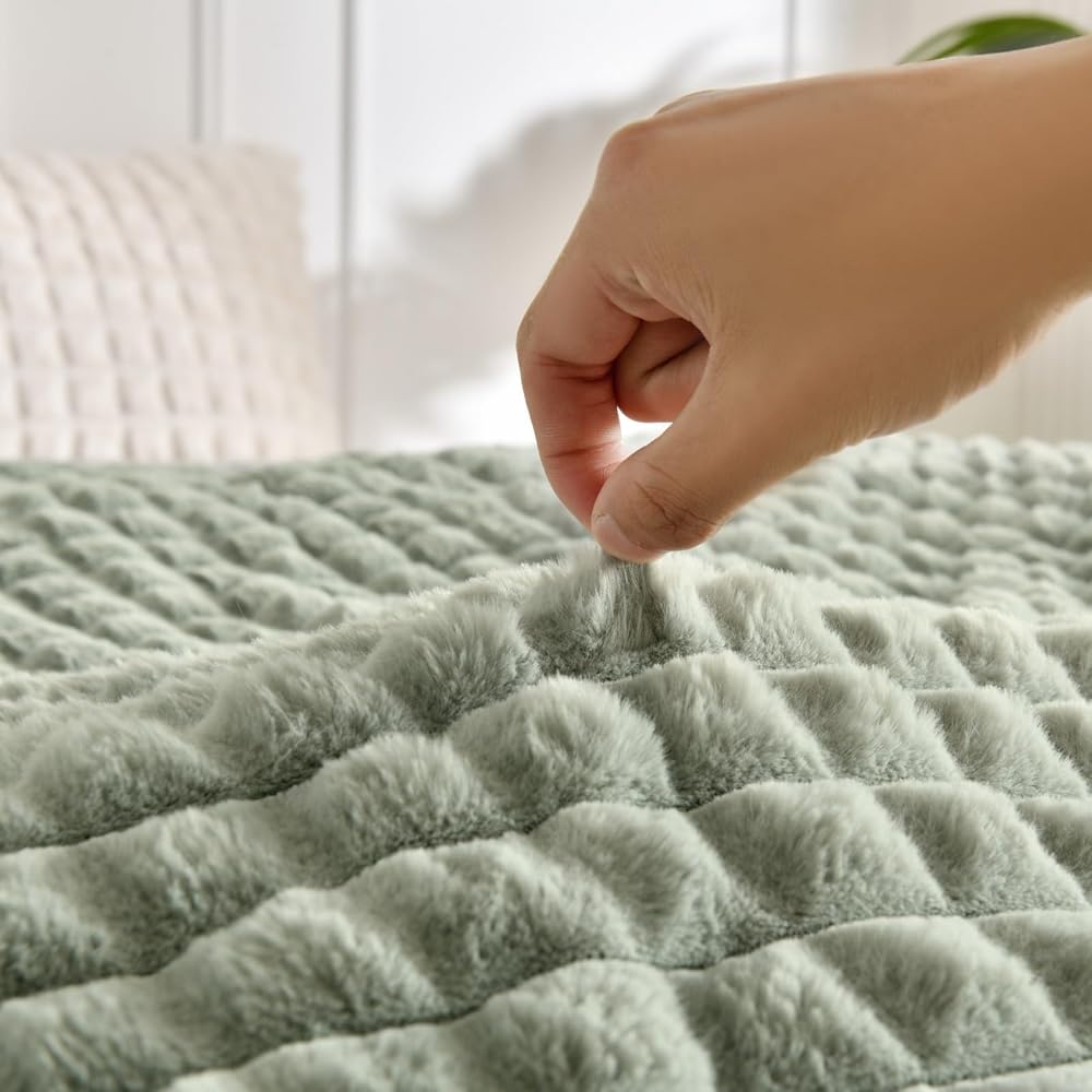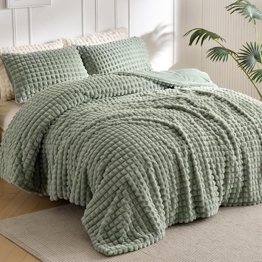 صناعة متقنة: طقم لحاف فروي كوين. تضمن الخياطة عالية الكثافة توزيعًا متساويًا للحشوة، مما يمنع التحول أو التكتل. وهذا يضمن الدفء الفائق والمتانة لهذا اللحاف المخملي الأشعث.