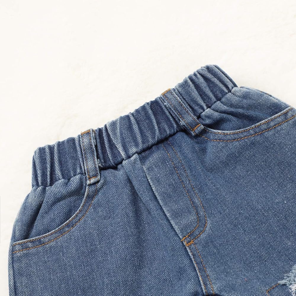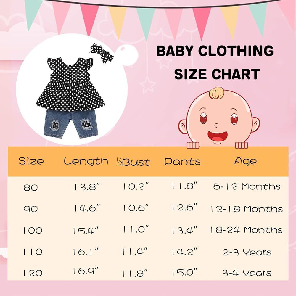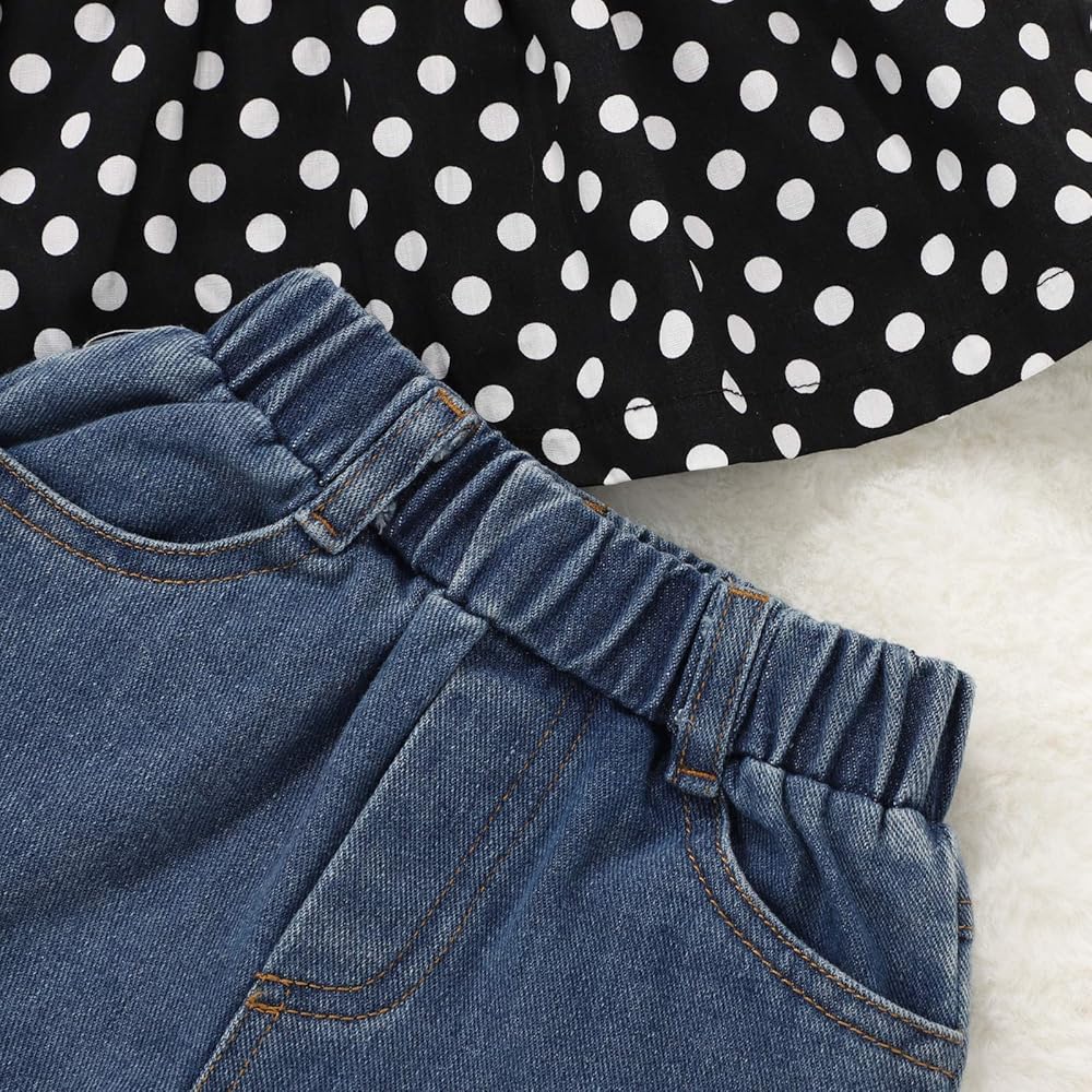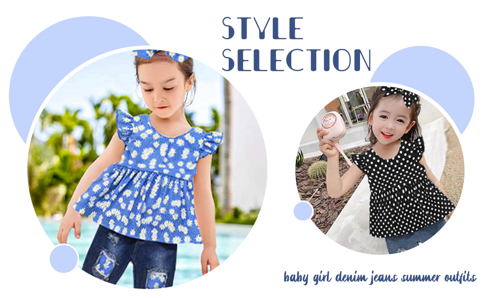 تصميم عصري: تصميم علوي مكشكش وزهور مع بنطلون جينز ممزق، لطيف وعصري. نحن على يقين من أن طفلتك الصغيرة ستحب طقم البنطال المزين بالزهور ولن ترغب في خلعه.