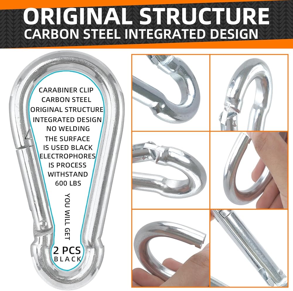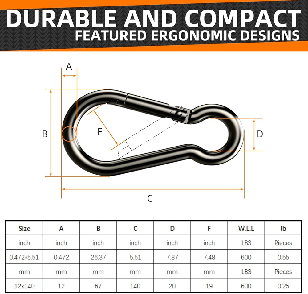 600 Lbs Load Bearing Capacity: Heavy duty carabiner smooth and thick frame 5.51 inch, wire diameter 0.472 inch, weight 0.529lb(240g), they can bear up to 600 lbs, high strength and long life, there are no sharp edges on it, making it a perfect carabiner for a keychain or backpack
