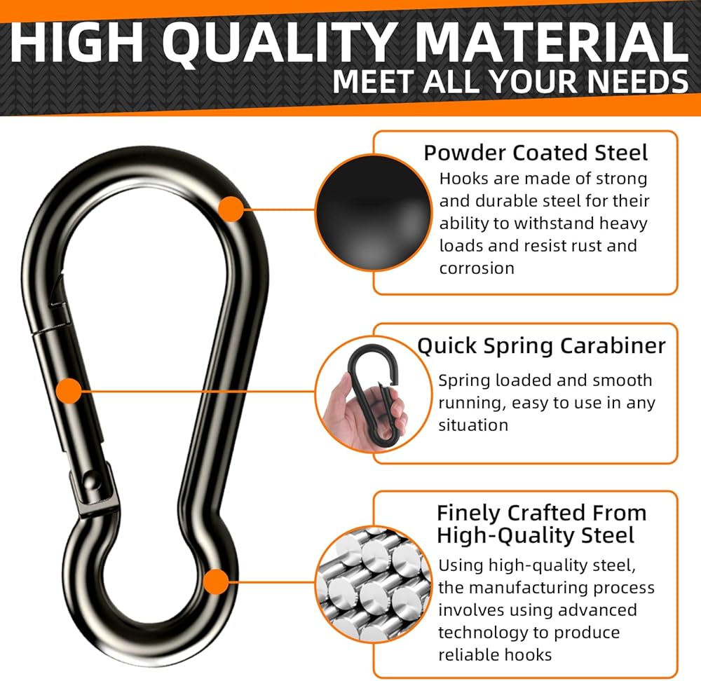Quick Lock and Snag Free: Carabiner heavy duty the made of high quality perfect link design of spring and steel allows you to easily open and close with one hand, the surface is very smooth and there are no sharp edges on it, it will not tear the fabric and your skin, allowing you to quickly connect keychains, ropes and backpacks