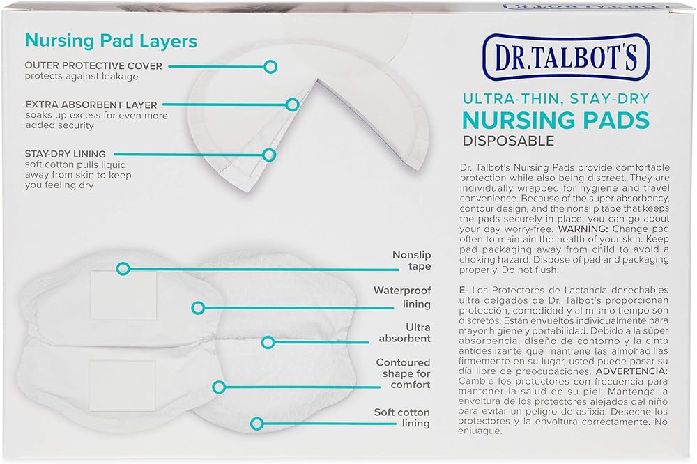 توفر وسائد الرضاعة من دكتور تالبوت حماية مريحة وفي نفس الوقت تتمتع بالخصوصية. فهي مغلفة بشكل فردي من أجل النظافة الشخصية والسفر المريح. بسبب الامتصاص الفائق وتصميم محيطي وشريط مانع للانزلاق يحافظ على الوسائد في مكانها، يمكنك الذهاب إلى يومك بدون قلق.