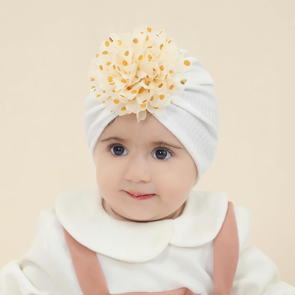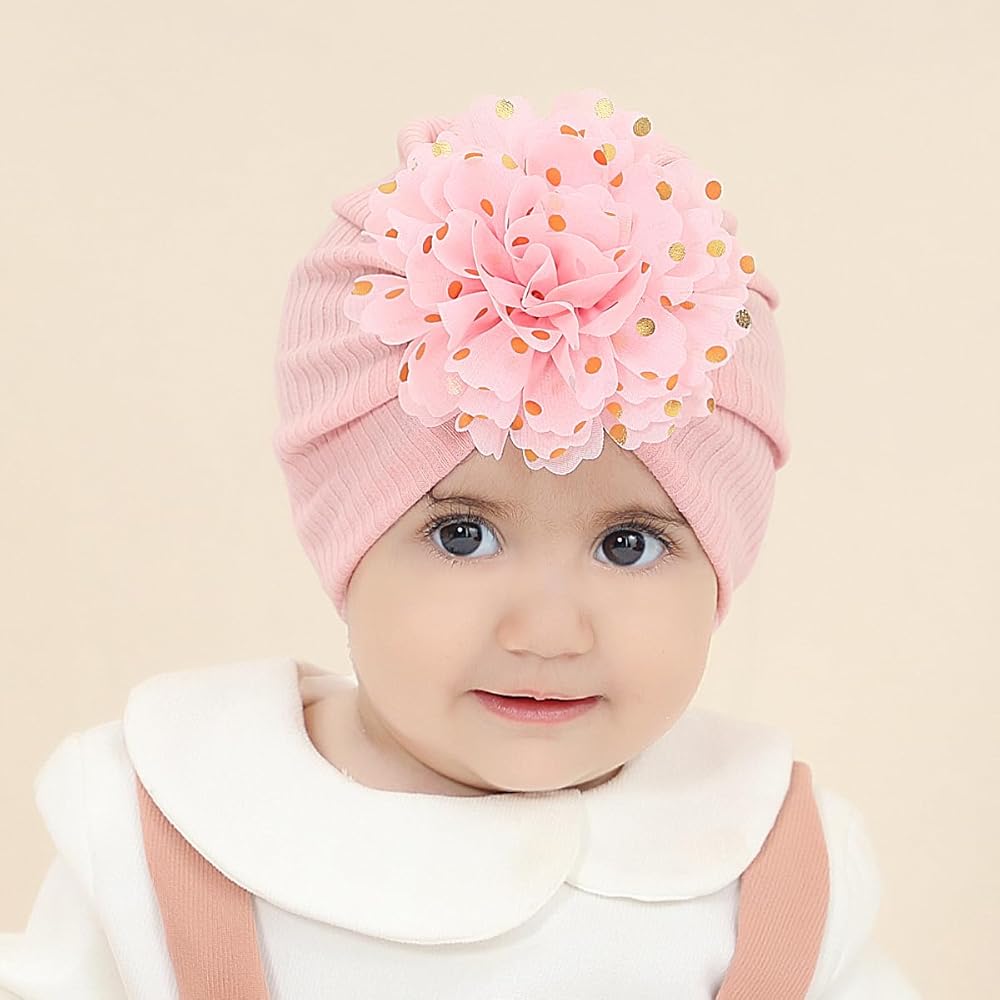 【مواد عالية الجودة】--قبعات عمامة للبنات الصغيرات مصنوعة يدويًا من الداكرون عالي الجودة مرفقة بزهور شيفون كبيرة منقطة. إنها قابلة للتمدد وناعمة ومريحة للفتيات الصغيرات.