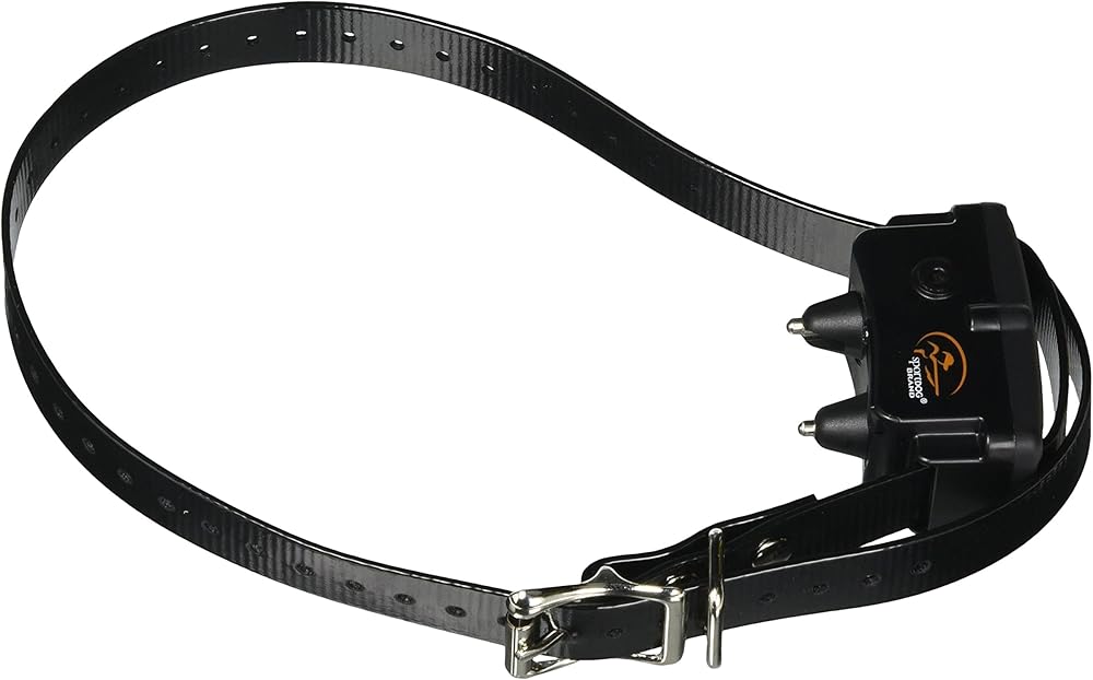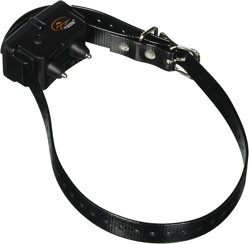 SportDOG No Bark Collar 10R Bark Control SBC-R uses a patented sensor system to provide the most reliable bark detection available. The unit delivers a static correction via the Contact Points only if it detects BOTH vibration from the vocal cords AND the sound of the bark. External noise or another dog's bark will not trigger a correction. The NoBark 10R offers 10 levels of correction. As a built-in safety feature, if your dog barks 15 or more times in 50 seconds in any mode, the unit will automatically shut off for 3 minutes. Fits neck sizes 6–28 inches. Contents NoBark 10R Collar. Black Collar Strap. Operating Guide. Charging Adaptor.
