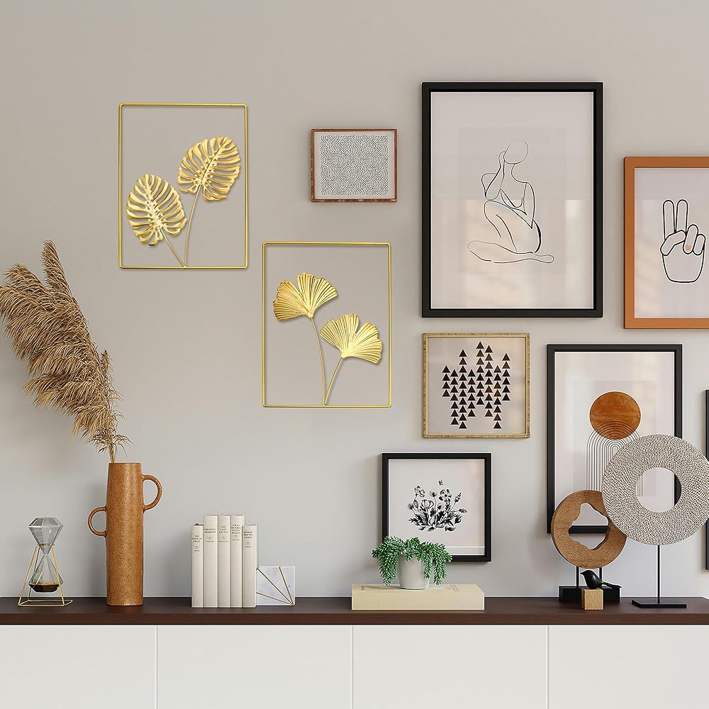 huoiqiue 2-مجموعة 16 "× 12" ديكور الجدار الذهبي الفن المعدني الذهبي يترك ديكورات المنزل، المعلقات الجدار المنحوتات لهجة الصور الزخرفية مع الإطار، ديكور لهجة الذهب لغرفة النوم وغرفة المعيشة