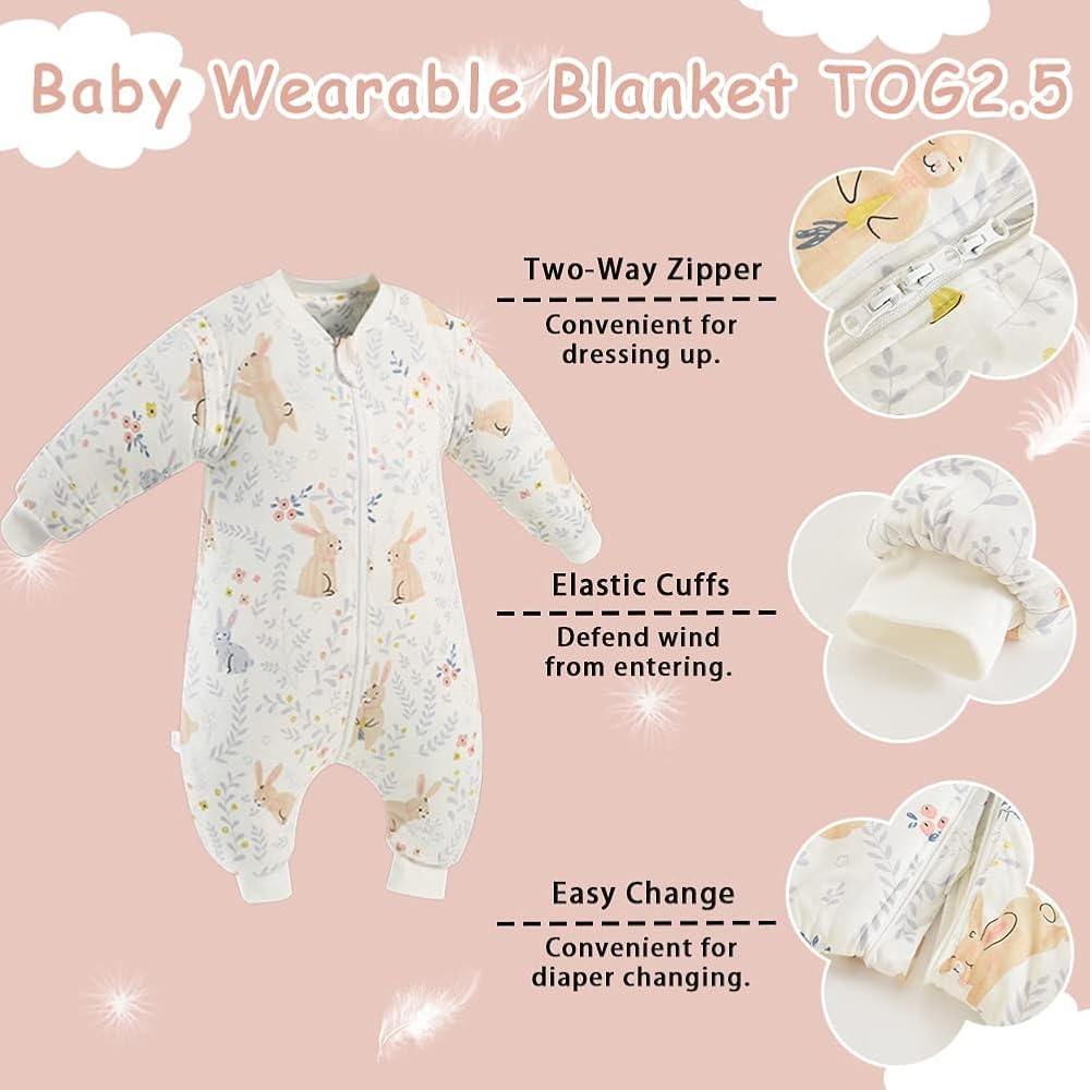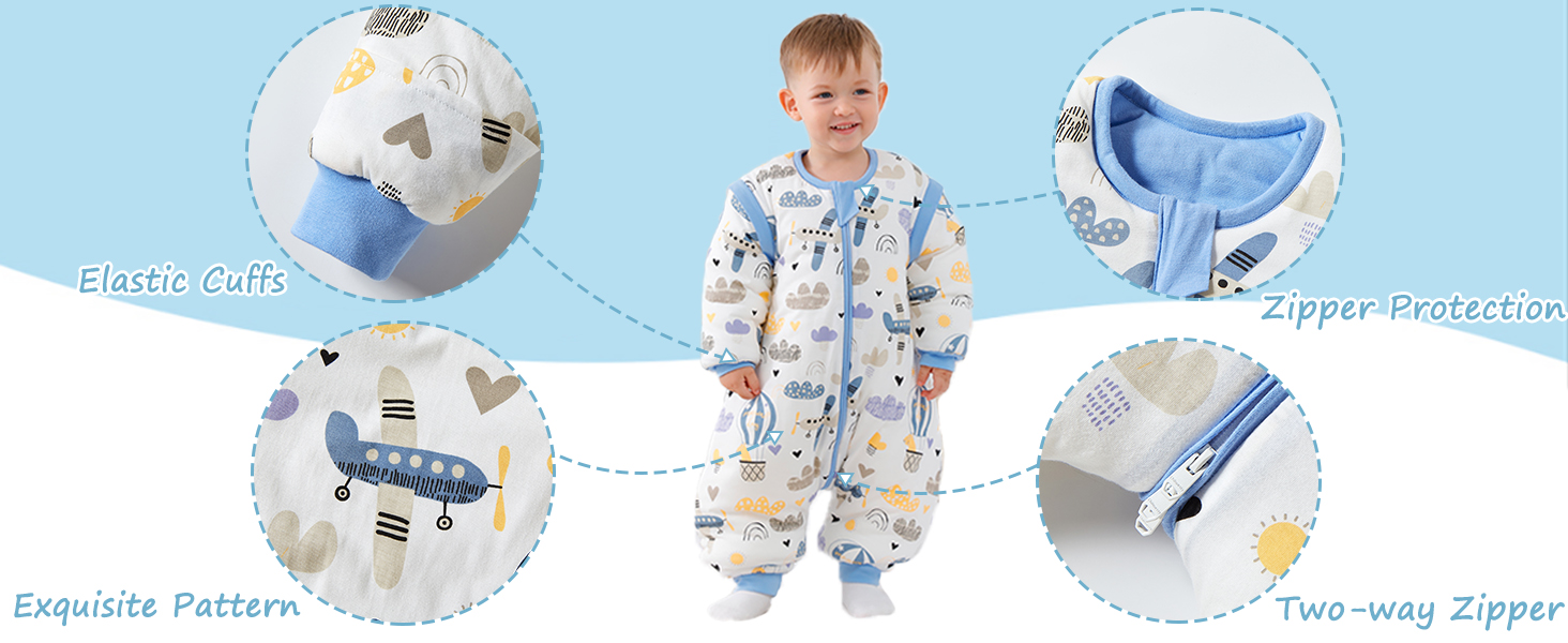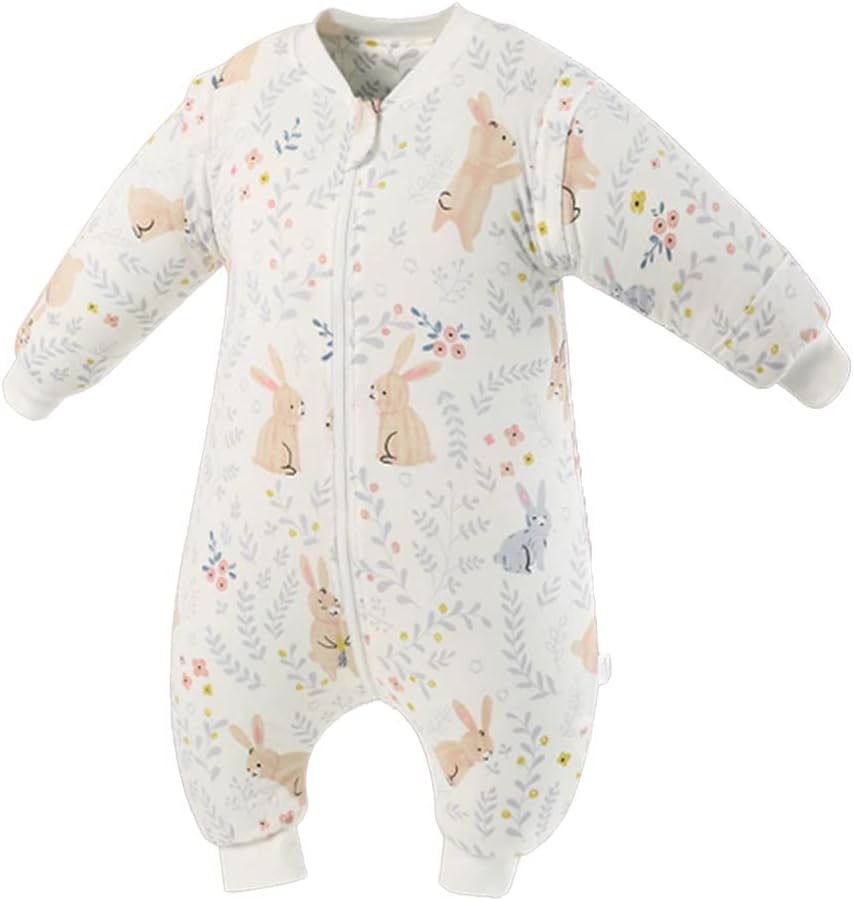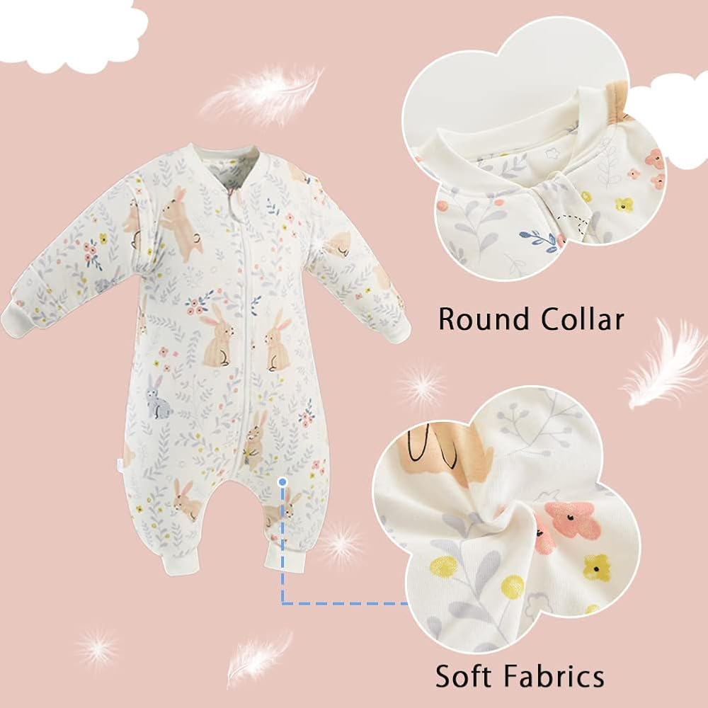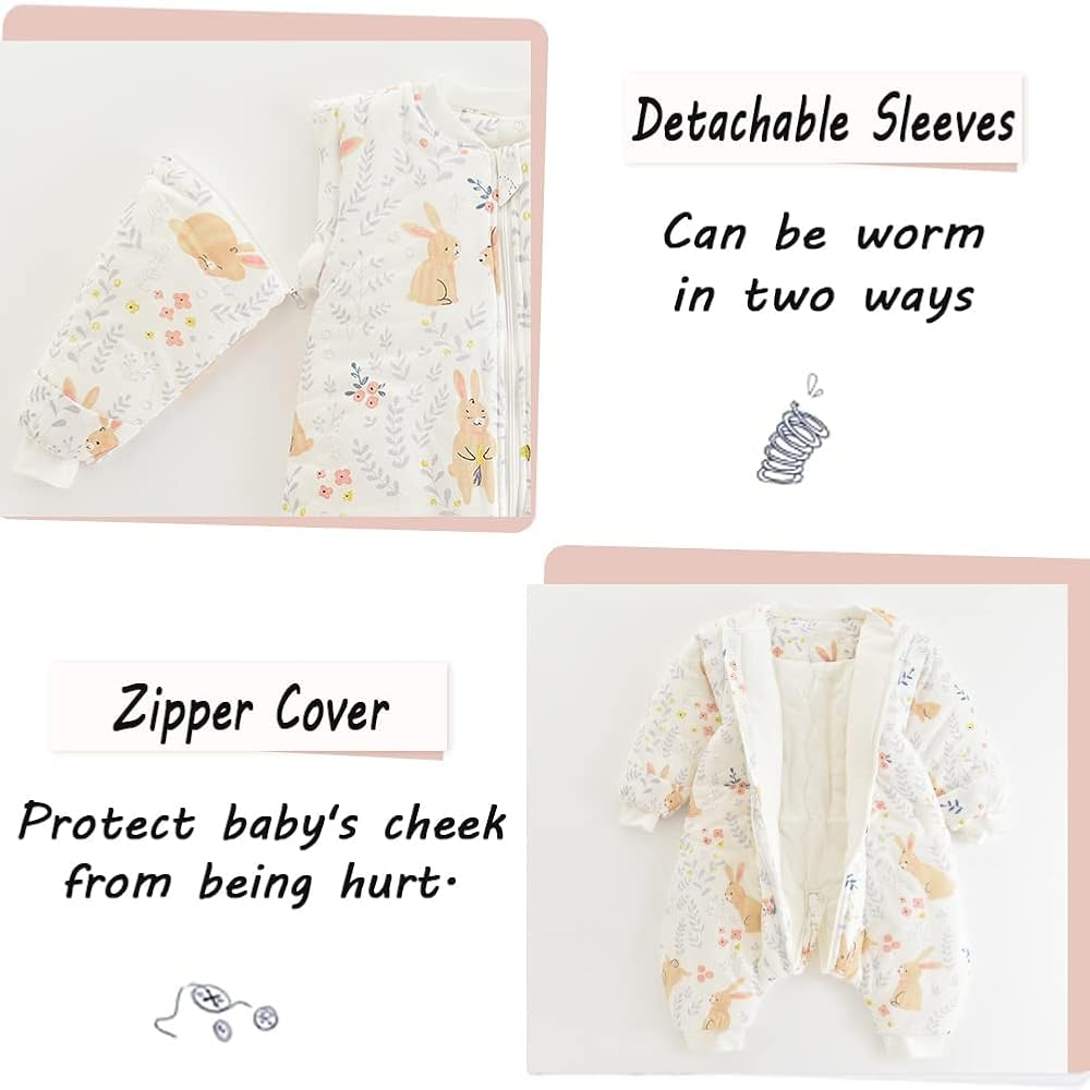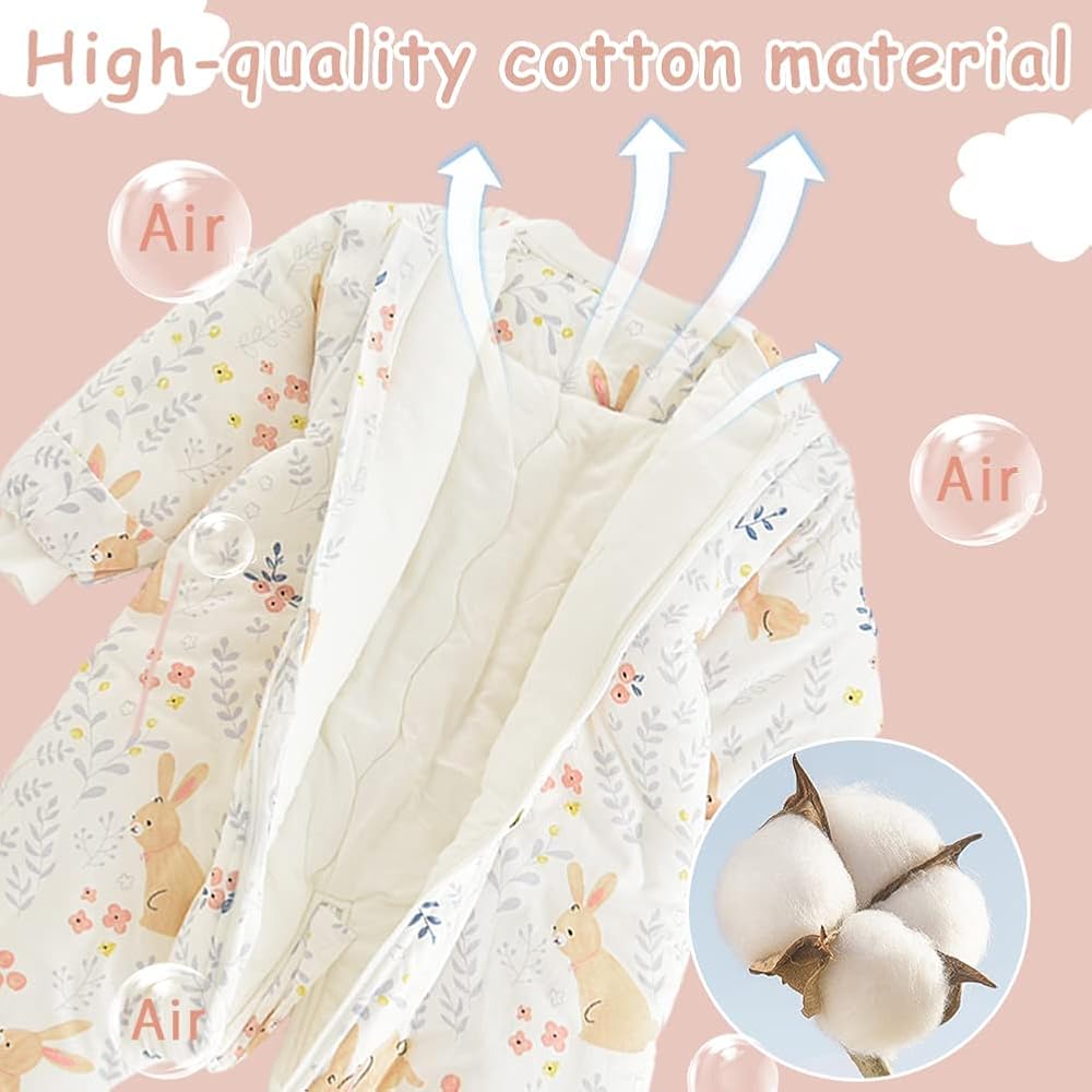 【تصميم كم قابل للفصل】تتميز حقيبة النوم القطنية للأطفال ذات الساق المقسمة بتصميم كم قابل للفصل، مما يسمح لك باختيار ما إذا كنت تريد إزالة الكم أم لا حسب درجة الحرارة والبيئة. تصميم الساق المقسمة يسمح لطفلك بالتدحرج بشكل أكثر راحة، مما يمنح طفلك نومًا دافئًا ومريحًا.