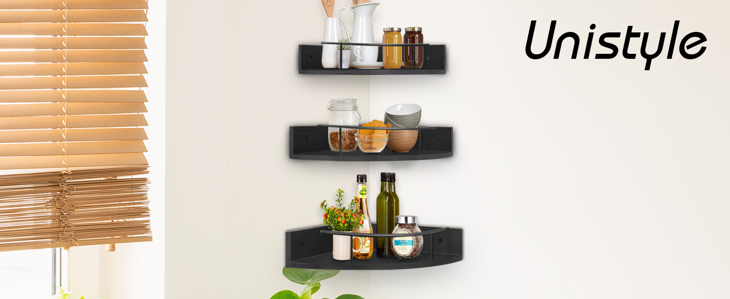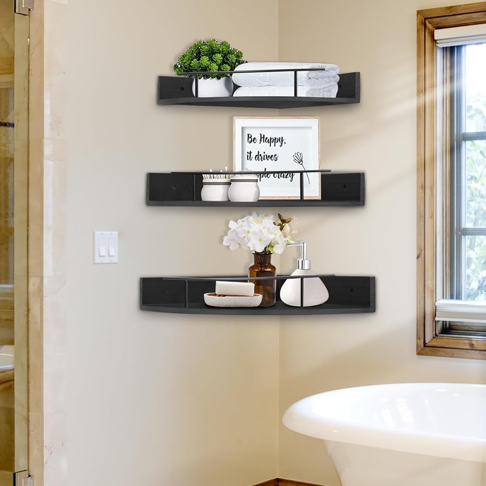Package List: 3* Wood Corner Wall Shelf 3* Metal Railing Feature: With its black main body and simple lines, paired with the adorable mini metal railing, it perfectly creates a minimalist yet elegant floating shelf that can easily complement all home decor styles, whether it's retro, modern, or country-style, or gothic etc. This floating corner shelves can be used as bedroom shelves to store small plants, albums, alarm clocks, books etc. You can place it in the bathroom to store towels, bathrobes, shampoo and other items. It's also suitable for the kitchen, where you can store spices & condiments, or in the laundry room for laundry pods and other items.