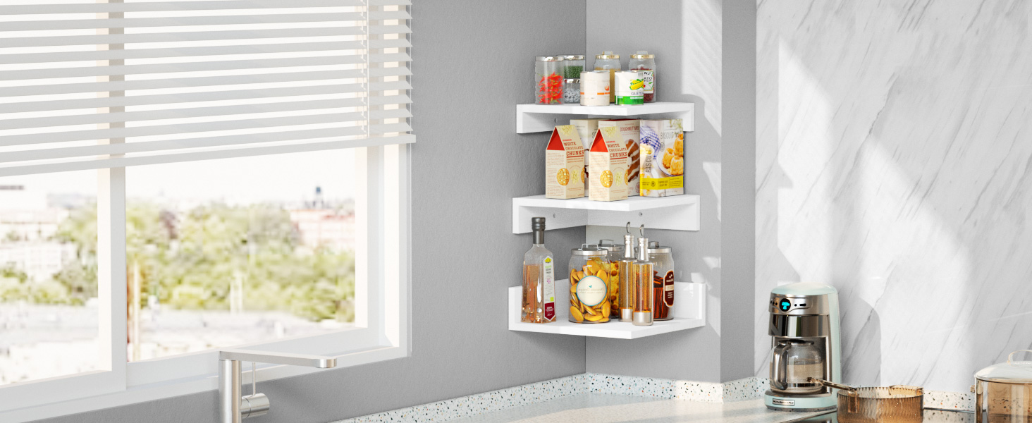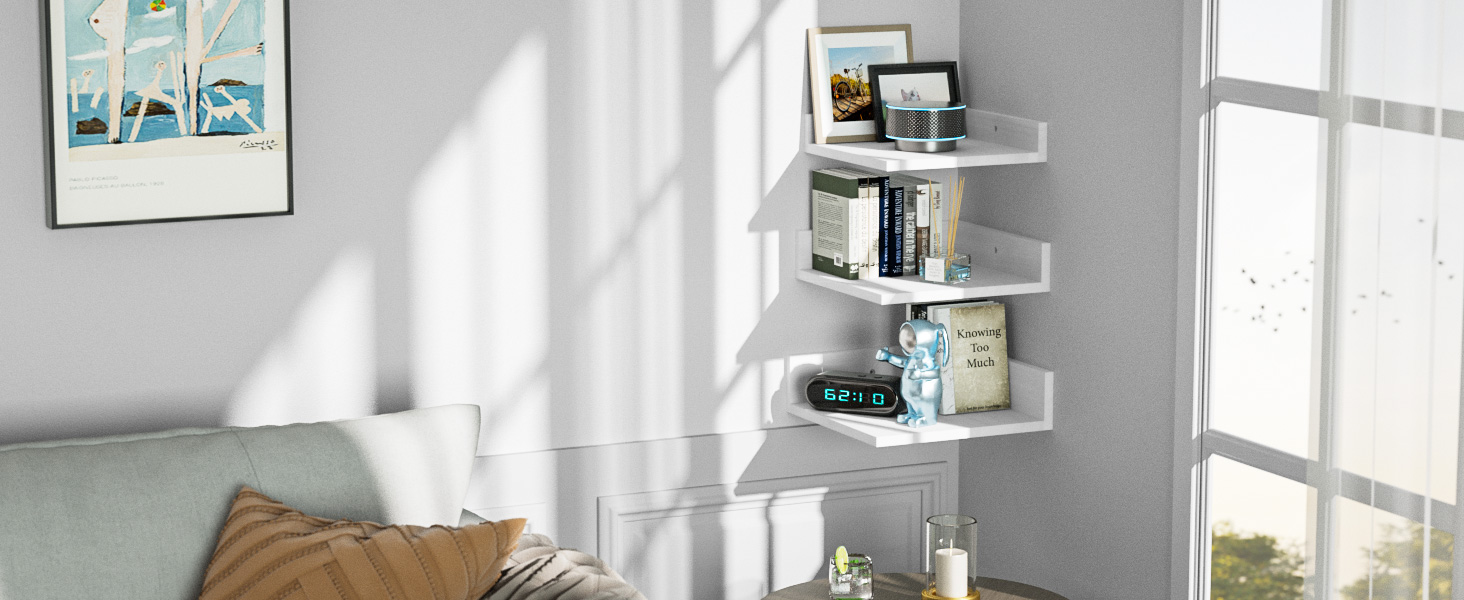 • استخدم ركنك: استفد من زواياك الفارغة مع أرفف الزاوية العائمة. اختيار مثالي لغرفة المعيشة أو غرفة النوم أو المطبخ لعرض النباتات أو الصور أو المقتنيات أو غيرها من العناصر الزخرفية.