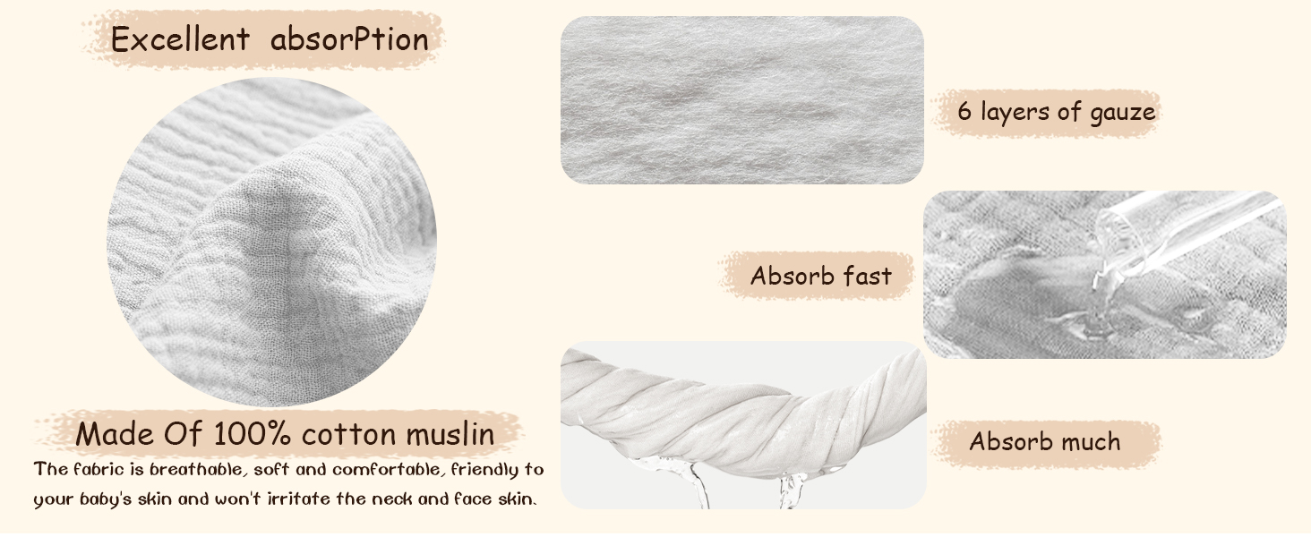 تصميم من 6 طبقات: تصميم صدريات الموسلين يحتوي على 6 طبقات وسميكة بما يكفي لامتصاص السوائل ومسح اللعاب والعرق بسهولة، مما يوفر الراحة والانتعاش لطفلك