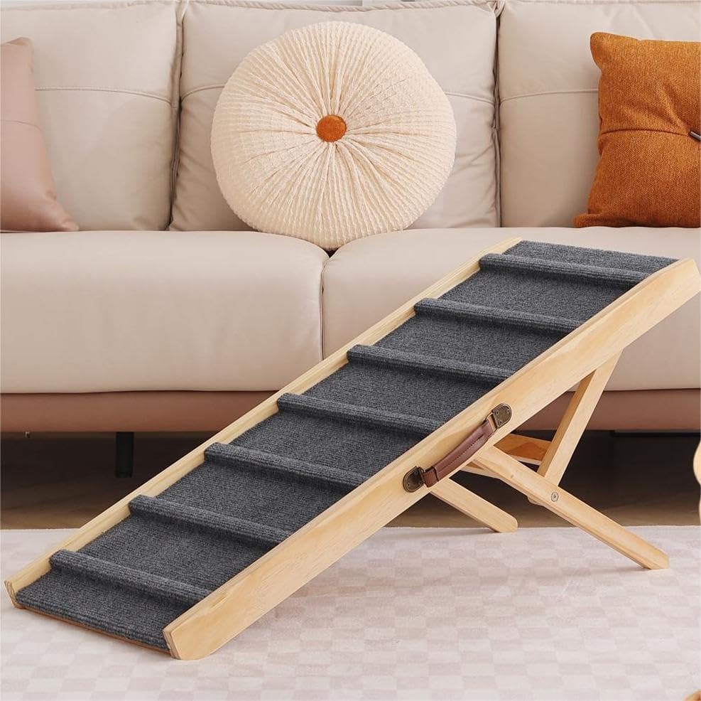 This dog cat pet ramp stairs for bed car couch suv is made of environmentally friendly pine wood and a very strong hardwearing carpet, which can help your beloved pets, including dogs, cats and other pets, easily get up to your high car truck couch suv bed sofa.so that you can enjoy the pleasant outdoors together or family time
