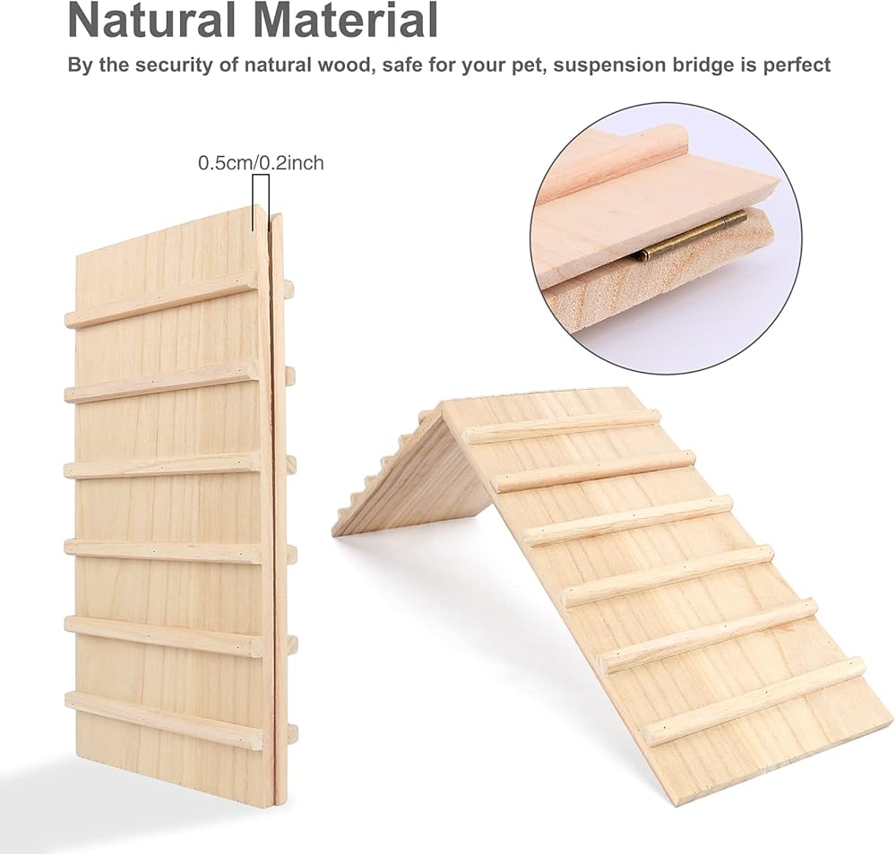 ❉【مخبأ للاسترخاء】: الجسر الخشبي قوي ومتين للغاية. منحدران يشكلان مخبأ صغير. يوفر هذا الجسر الطبيعي مأوى خاصًا وآمنًا ومريحًا. ستحب حيواناتك الأليفة الاسترخاء تحت الجسر والتسلق فوقه. بالمناسبة، يتم وضعها بشكل مثالي في قفص حيواناتك الأليفة الجميلة وتسمح لحيواناتك الأليفة الصغيرة بممارسة المزيد من التمارين.