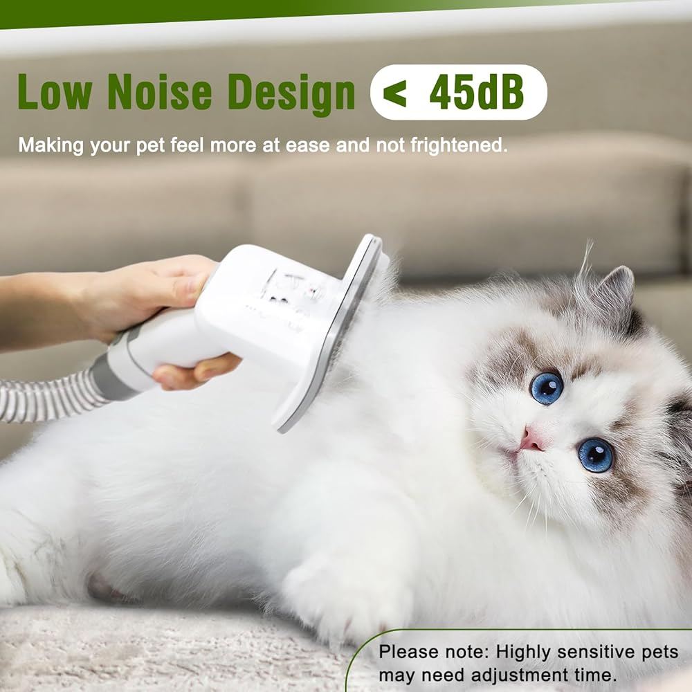 تصميم منخفض الضوضاء: طقم العناية بالمكنسة الكهربائية للحيوانات الأليفة بقوة 65 ديسيبل فقط لن يخيف حيوانك الأليف. سيستمتع حيوانك الأليف بالتنظيف بالفرشاة والعناية. عند استخدامه لأول مرة، نوصي بعدم تشغيله فجأة وإعطاء حيوانك الأليف عملية التكيف.