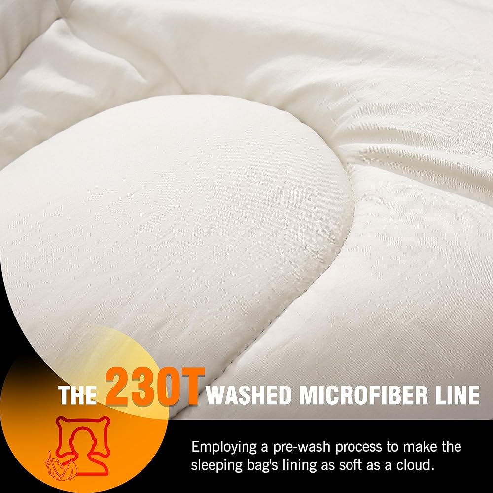 【بطانة تشبه القطن】نسيج الألياف فائق النعومة المغسول بالماء 230T مناسب أكثر للمخيمين الذين يفضلون ملمسًا يشبه القطن. تتميز بملمس القطن ولكنها ليست عرضة للرطوبة، مما يسمح لأكياس النوم من سلسلة Harmony بتوفير بعض العزل في البيئات الرطبة.
