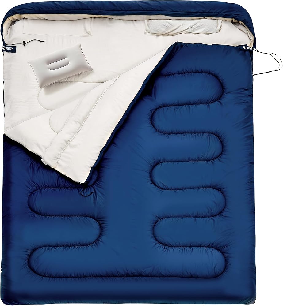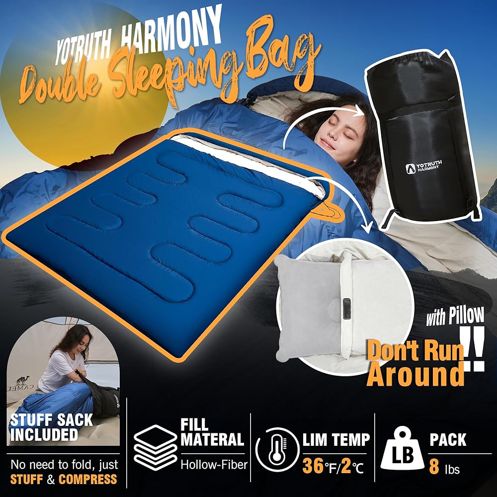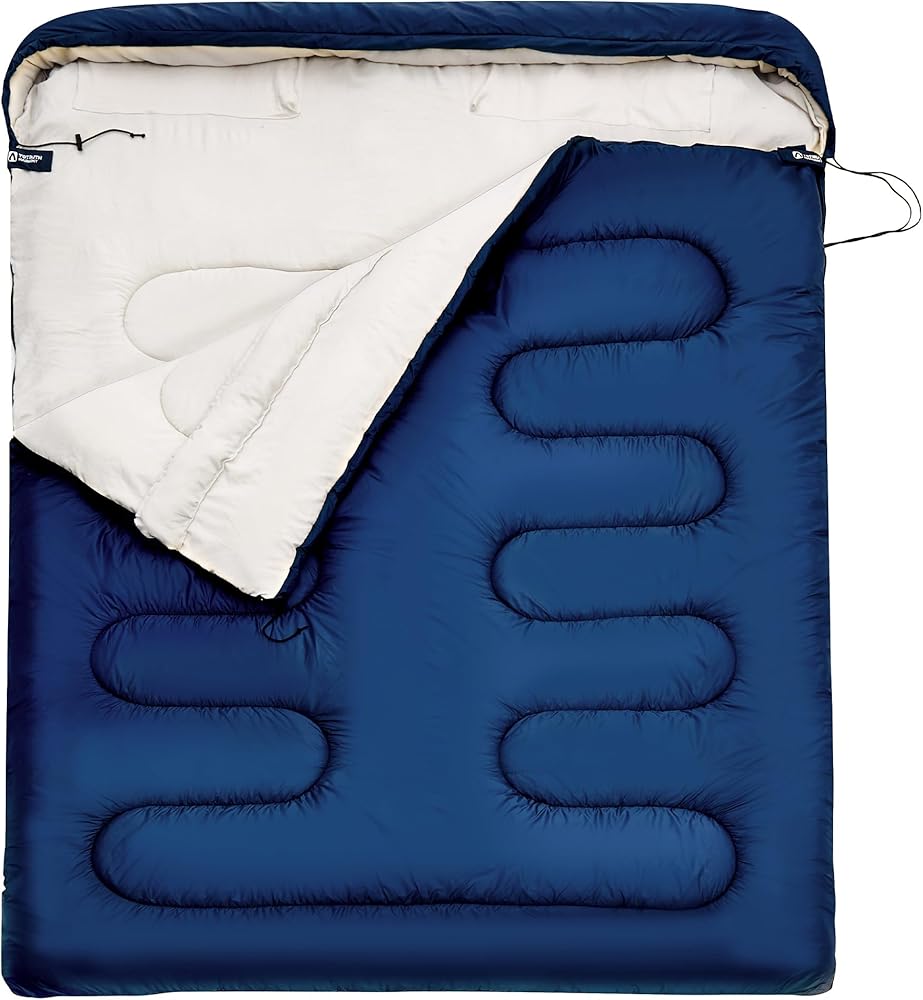 【حجم أكبر】يبلغ طوله 230 سم وعرضه 165 سم، تخلص من أكياس النوم المزدوجة المقيدة للبالغين واستمتع بتجربة واسعة ومريحة مع عائلتك في أكياس النوم هارموني للبالغين لشخصين. لقد صممنا سحابين على شكل حرف L، مما يسمح لك بفتح كيس النوم بالكامل لتوفير مساحة أكبر.
