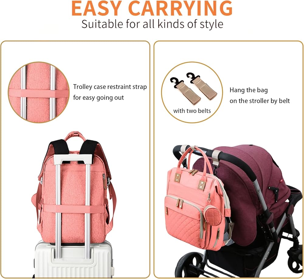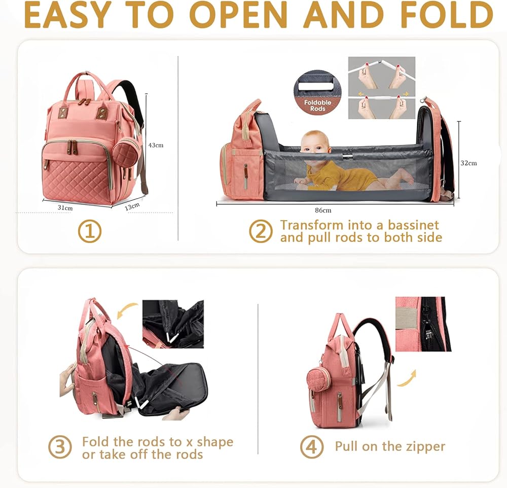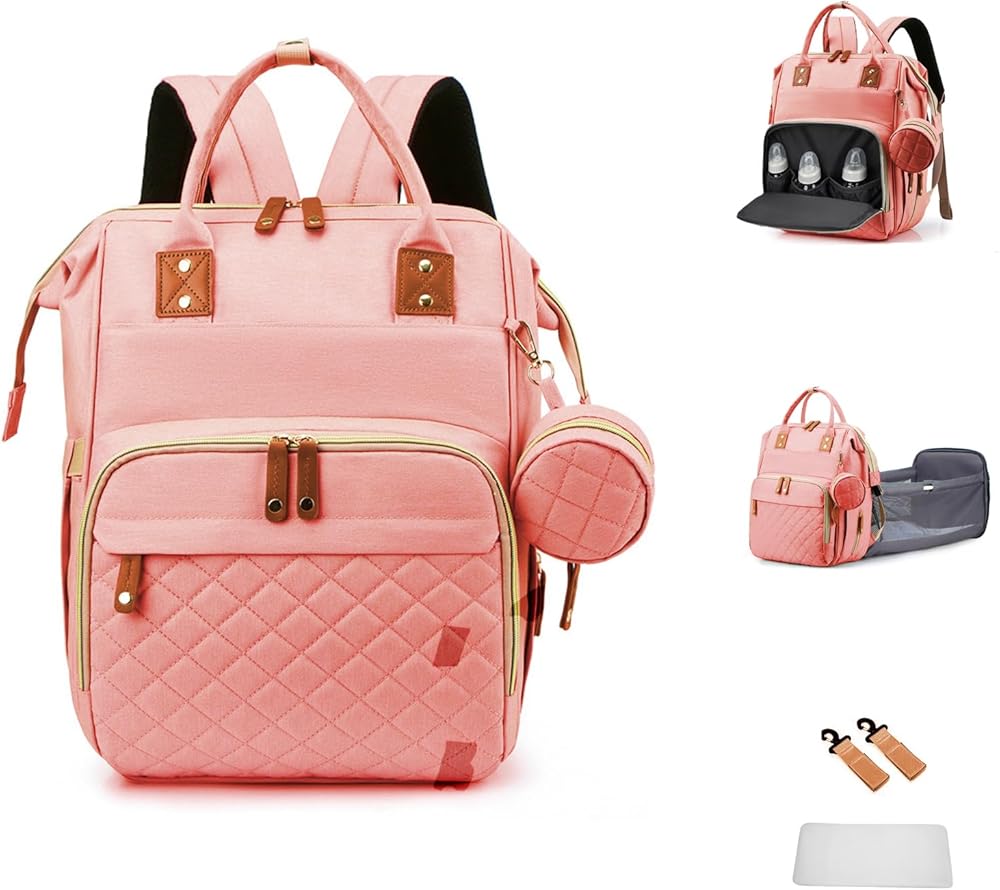 حقيبة ظهر لحفاضات الأطفال من GurZinn مع محطة تغيير الحفاضات للسفر مقاومة للماء 3 في 1 وسادة قابلة للطي للجنسين باللون الوردي