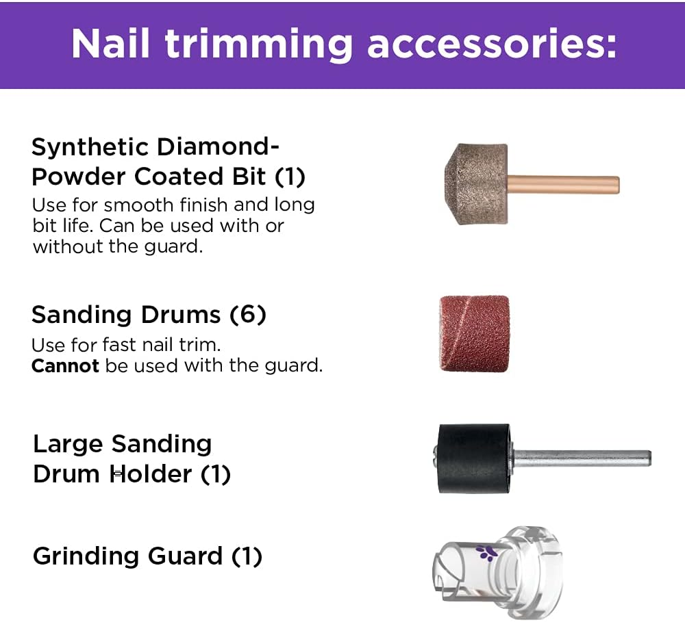 ملحقات مختلفة لتلبية الاحتياجات المختلفة: تأتي مع لقمة مطلية بمسحوق الماس الصناعي وأسطوانات صنفرة حتى تتمكن من استخدام الملحق الذي يعمل بشكل أفضل مع حيوانك الأليف
