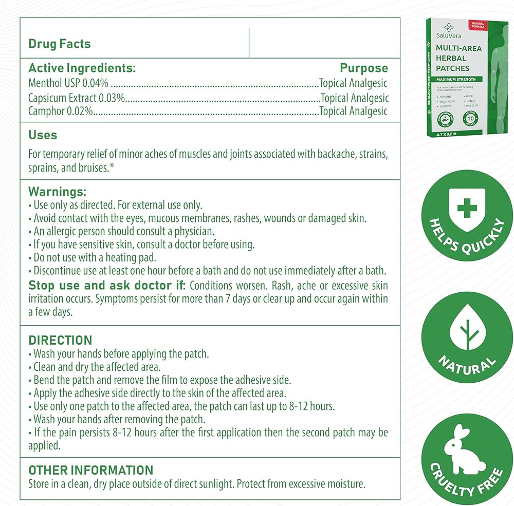 Many individuals experience various types of discomfort, from back to muscle issues. If you or someone you know is seeking an alternative to medication, these 2.75 x 4-inch patches might be an appropriate choice. They are intended for temporary use and can be applied to areas such as the back, joints, hip, neck, head, shoulder, knee, muscles, tendons, and feet. These patches contain natural ingredients, including capsicum extract, menthol, and camphor. These components are designed to provide a warm sensation upon application and are meant to penetrate the skin quickly once applied. A notable feature of these patches is their discreetness under clothing. They are made to leave no greasy residue or stains, facilitating ease of use in everyday life.