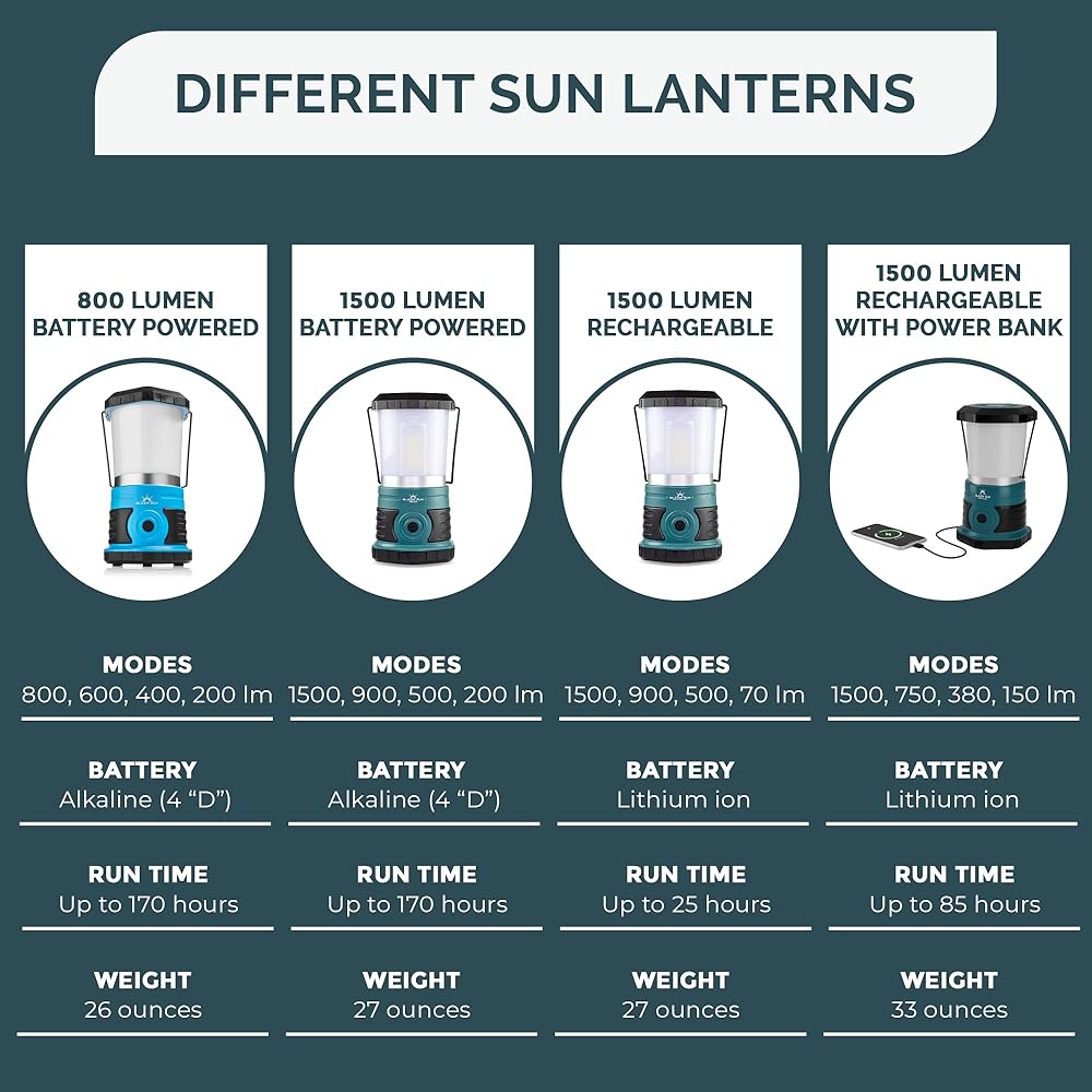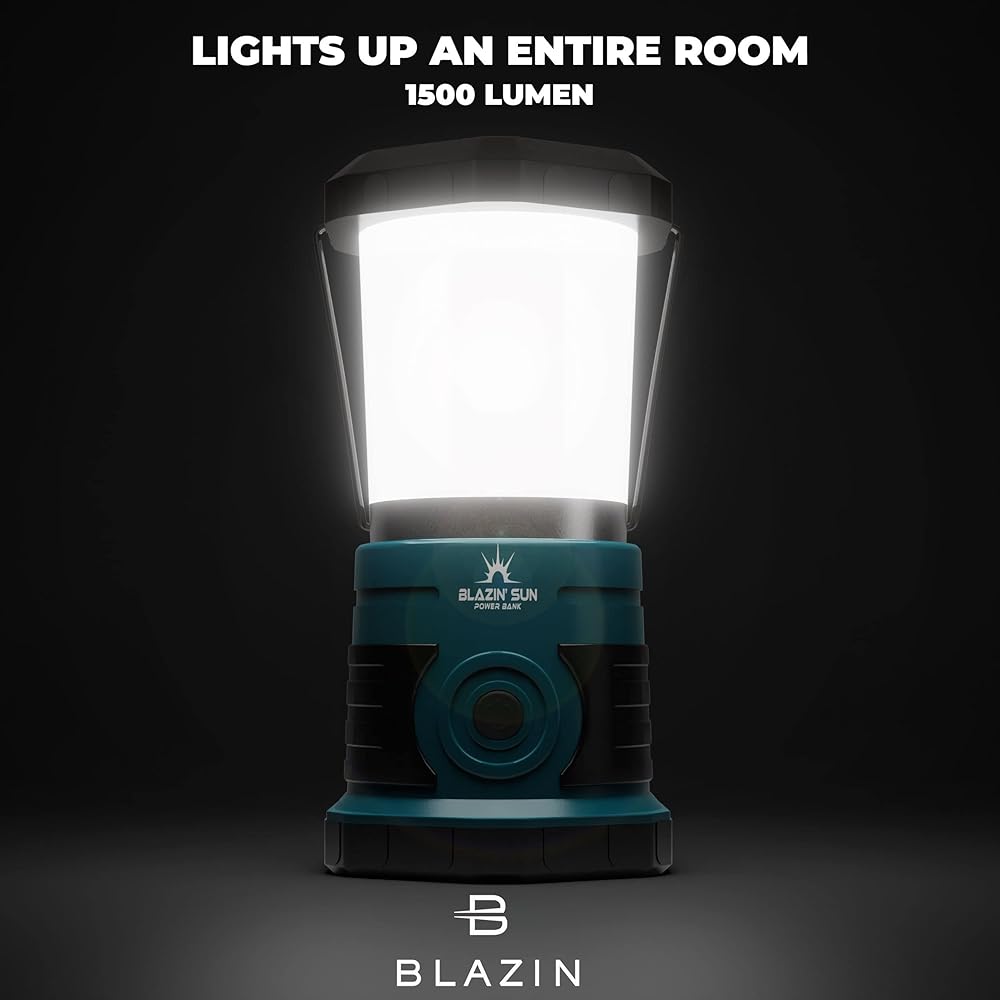 بلازين صن 1500 لومن | فوانيس ليد قابلة للشحن مع بنك الطاقة | الإعصار، الطوارئ، العاصفة، ضوء انقطاع التيار الكهربائي | وقت التشغيل 85 ساعة (أزرق مخضر)