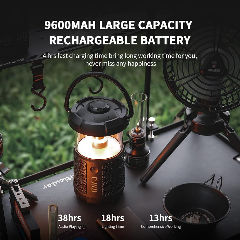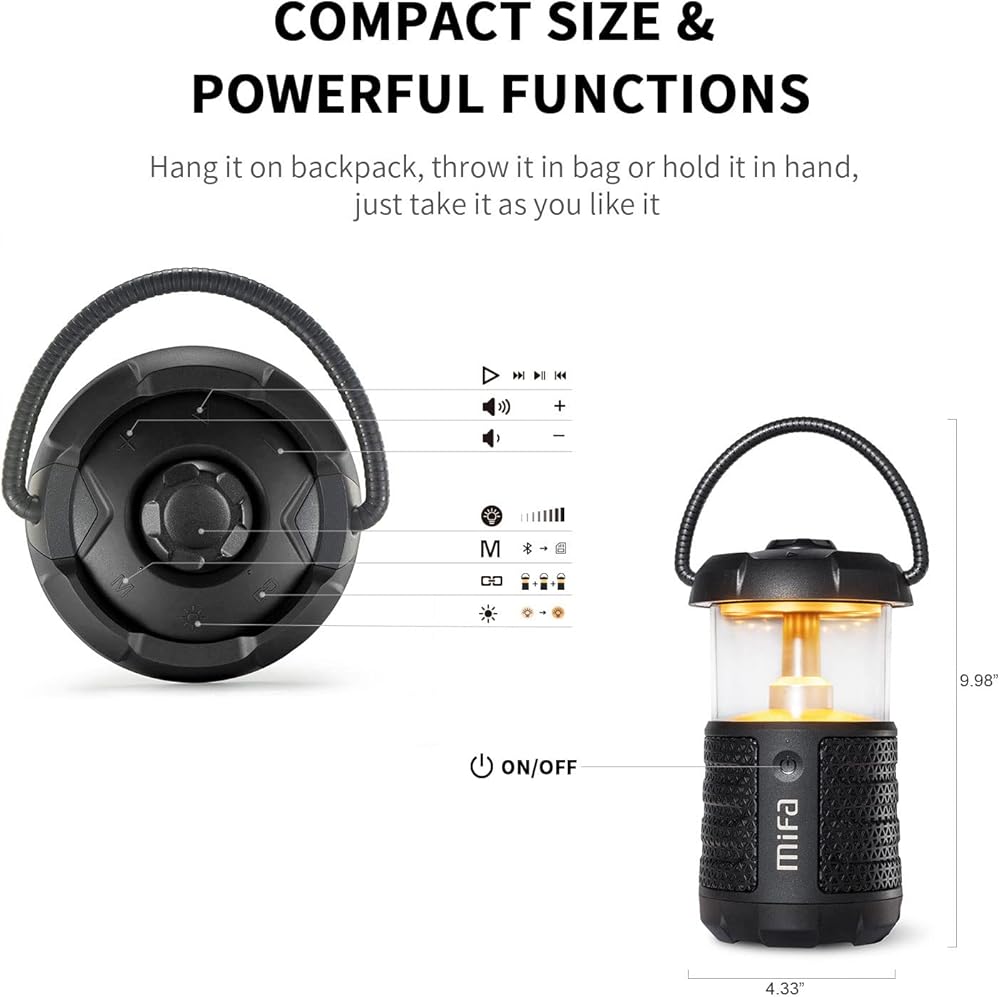 هدايا تخييم رائعة - إذا كنت تبحث عن هدايا للرجال أو النساء في الهواء الطلق، فإن مكبر صوت فانوس التخييم MIFA سيكون أفضل فكرة - مصمم بمصابيح LED قابلة للتعتيم بلونين ومكبر صوت جهير عميق عالي، يجب أن يكون لديه معدات تخييم للتخييم في الخيام، وتخييم السيارة أو لمحبي التنزه سيرًا على الأقدام، رائع للاستخدام المنزلي أو الحمام أو حمام السباحة أو المطبخ أو غرفة النوم، أينما تحتاج إلى الموسيقى أو الأضواء