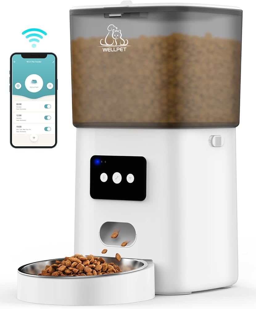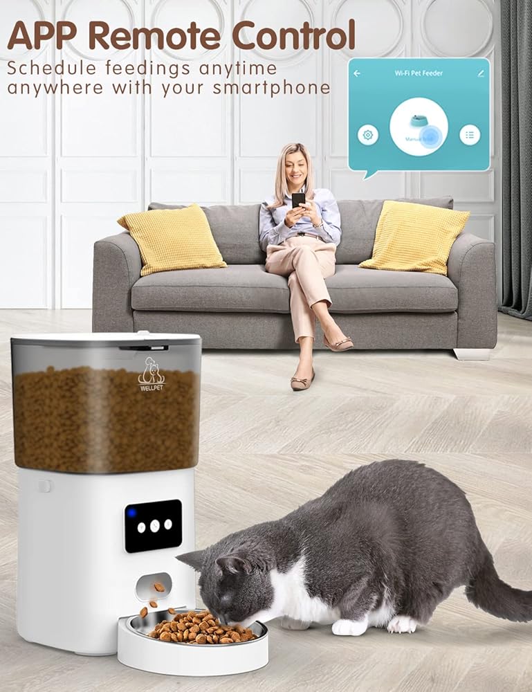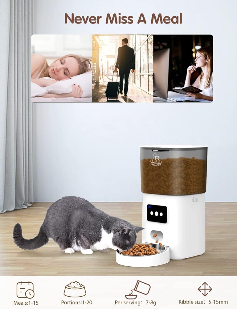 😸【Smart Feeder with WiFi】: It is very important to customize a scientific and healthy meal plan for pets. The WELLPET pet feeder can remotely control your pet's mealtime anytime, anywhere using your smartphone! Up to 15 meals, 20 servings each, 7-8g per serving. The automatic dog feeder will regularly feed your pet when you need to travel or go on vacation, no more getting up early to feed a hungry pet! (Only supports 2.4GHz WiFi and dry food 2-15mm)