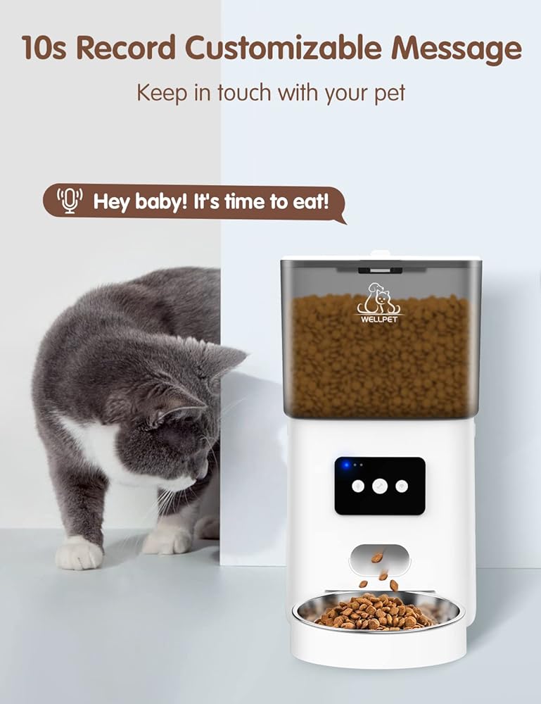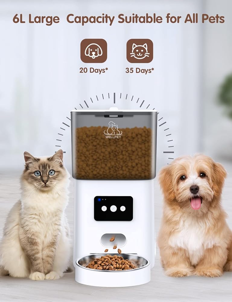 😸【6L Large Capacity】: Upgraded 6L large capacity can automatically and continuously provide food for your cats and dogs for several days, ensuring that you don't have to worry about pets during overtime or short trips! The WELLPET cat food dispenser comes with a removable stainless steel bowl that provides protection for your pet's health, prevents black chins, is easy to remove and easy to clean.
