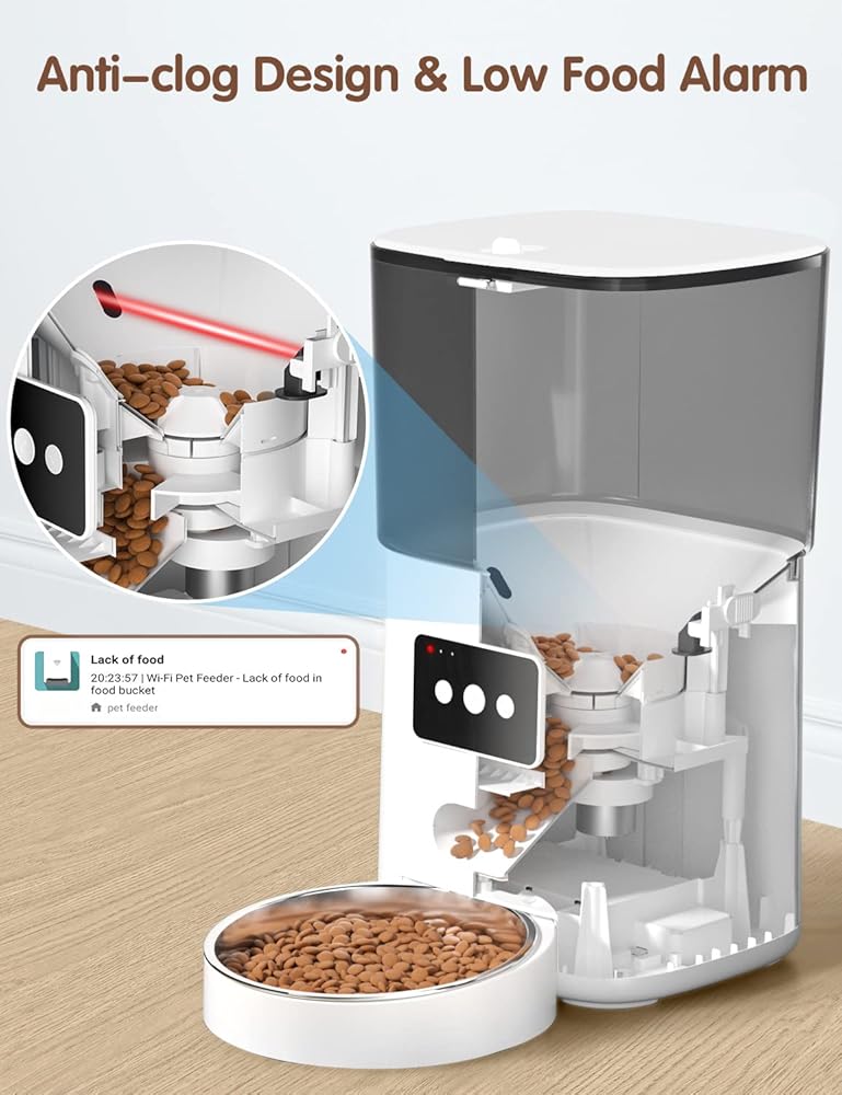 😸【Anti-clogging and Low Food Alarm】: Pet food dispenser also has an anti-clogging function to ensure unobstructed food delivery. The interior is equipped with an infrared sensor, When the food is insufficient, the panel indicator will turn red, and your mobile phone will also receive a message notification from the feeder, so that you no longer forget to replenish food.