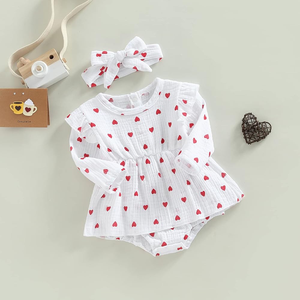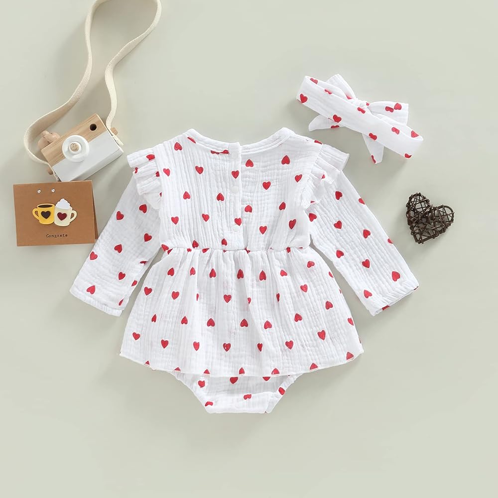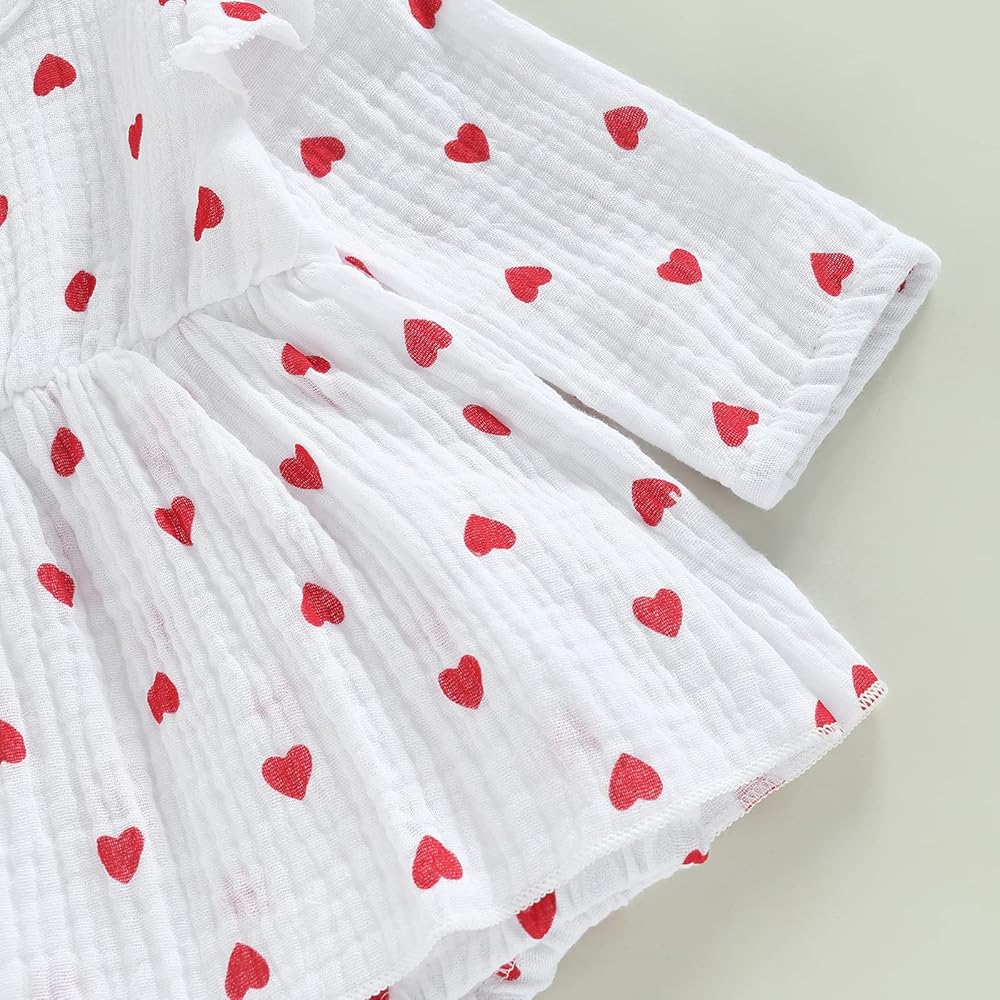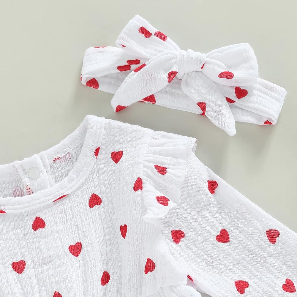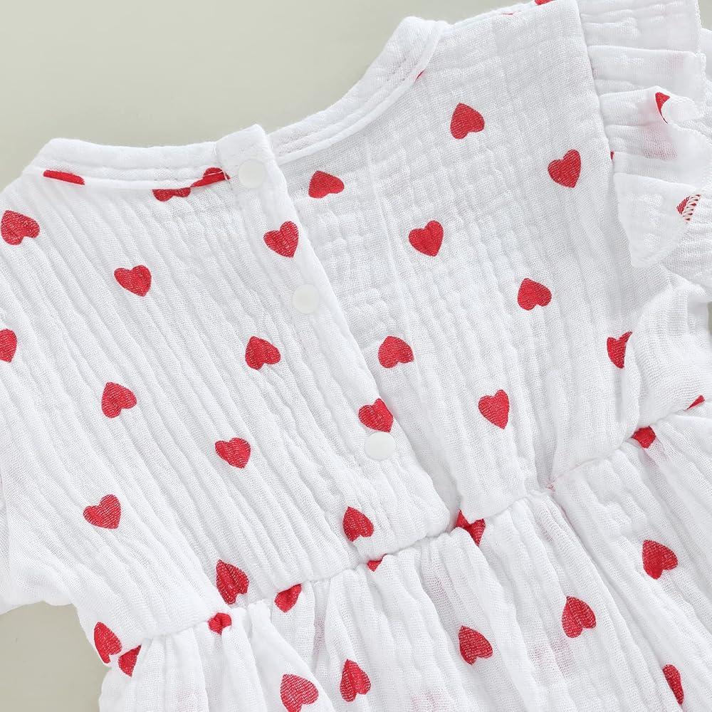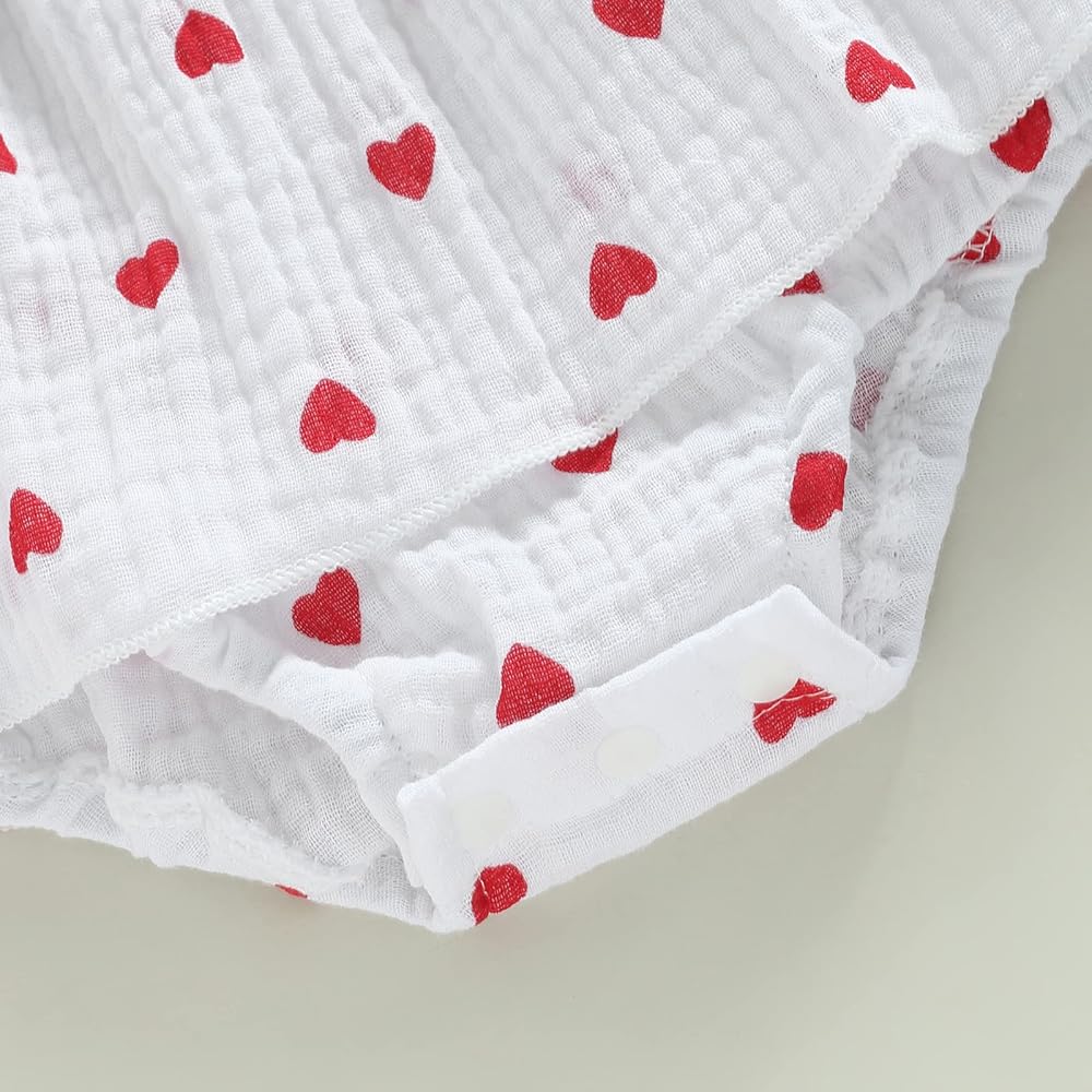 • [الميزة]: رومبر لحديثي الولادة للفتيات الصغيرات لعيد الحب. أكمام ذبابة، طباعة قلب، فستان مكشكش. زر إغلاق بكباس يجعل من السهل تغيير الحفاضات. ملابس عيد الحب قطعة واحدة.