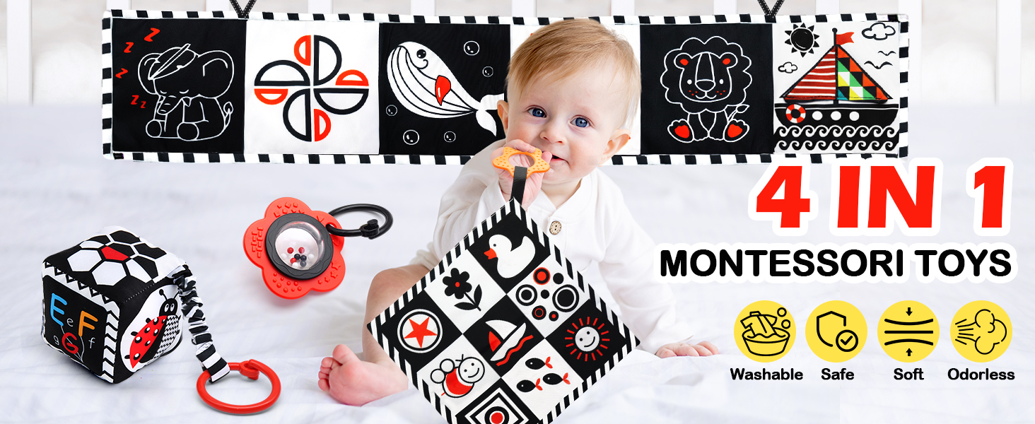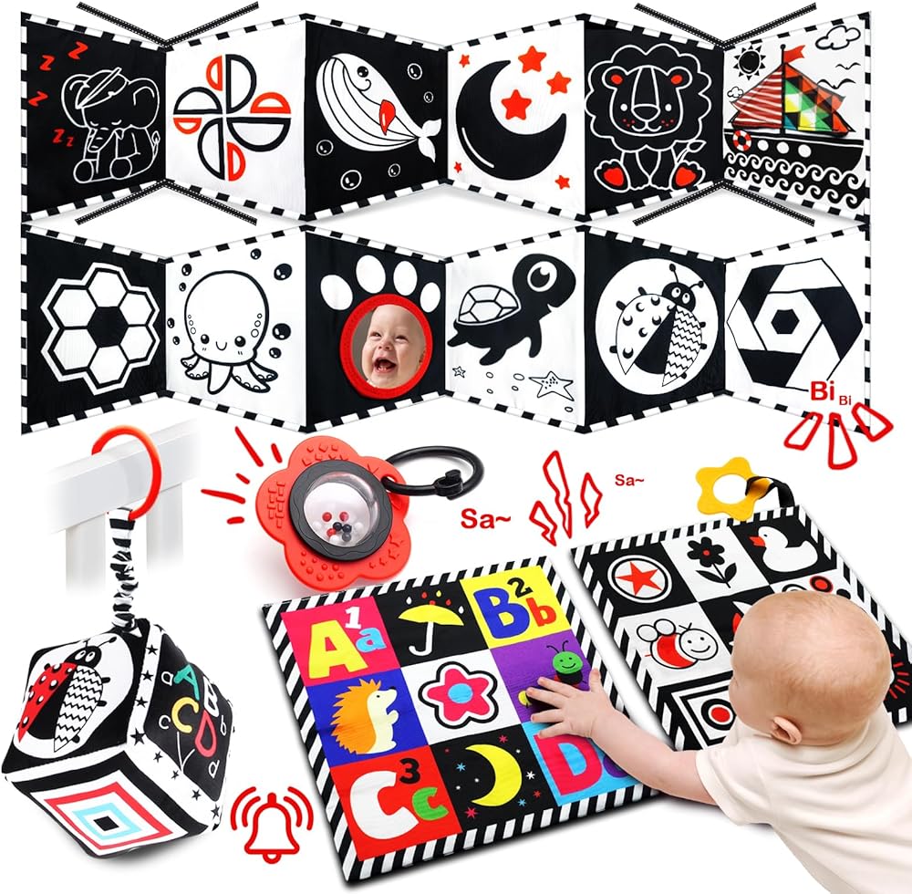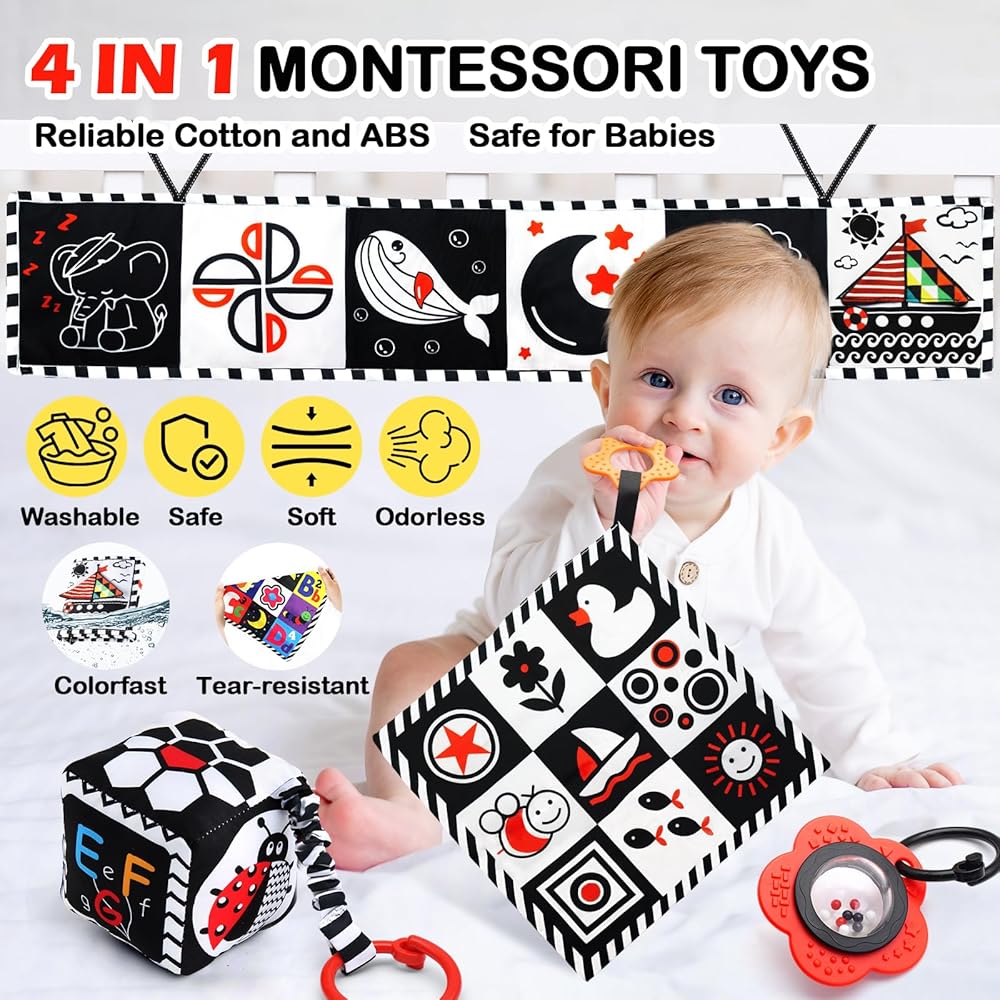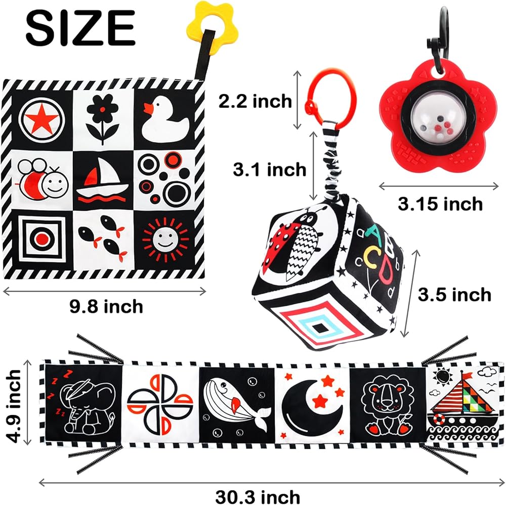 ToyUnited 4 قطع ألعاب أطفال من عمر 0 إلى 3 أشهر، ألعاب حديثي الولادة باللونين الأبيض والأسود عالية التباين لتطوير الدماغ، ألعاب وقت البطن، ألعاب مونتيسوري للأطفال ألعاب كتاب مجعدة حسية ناعمة من عمر 6 إلى 12 شهرًا