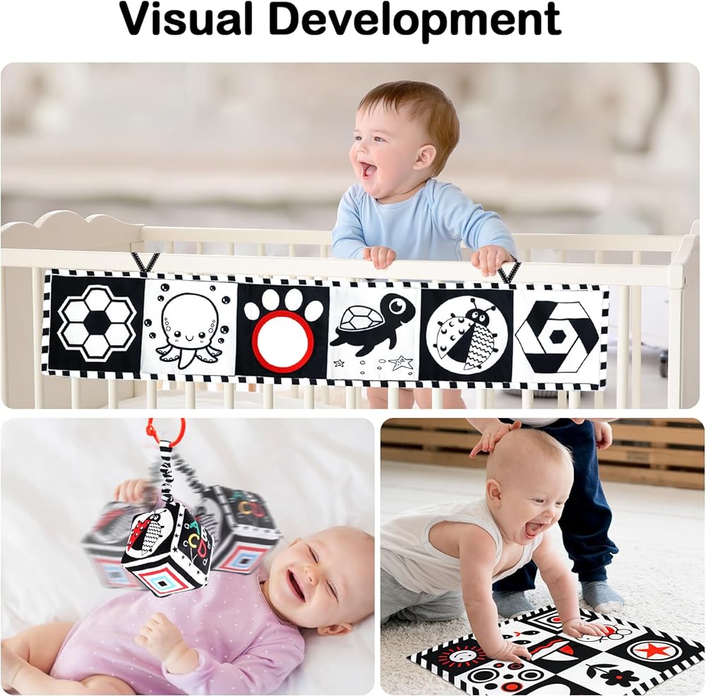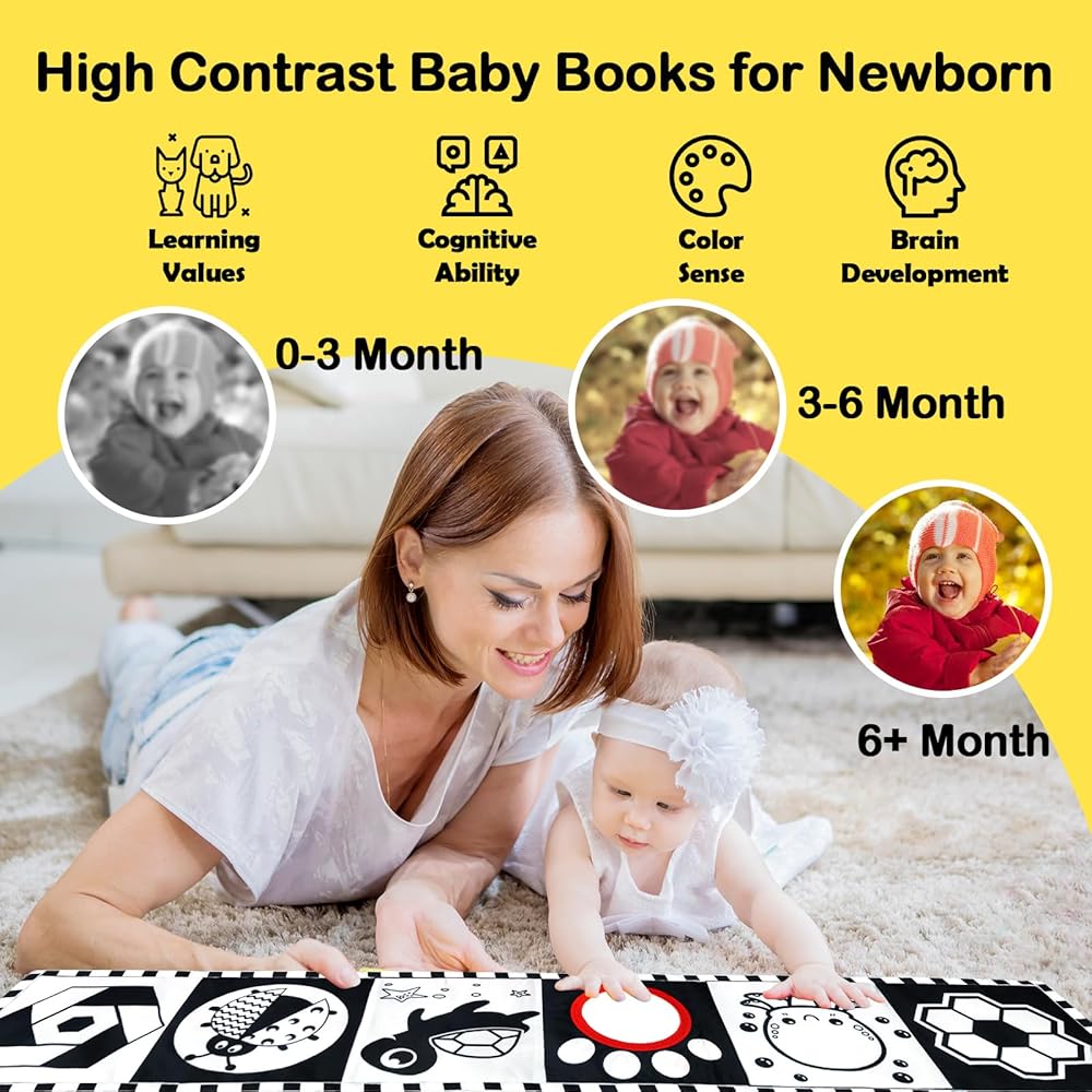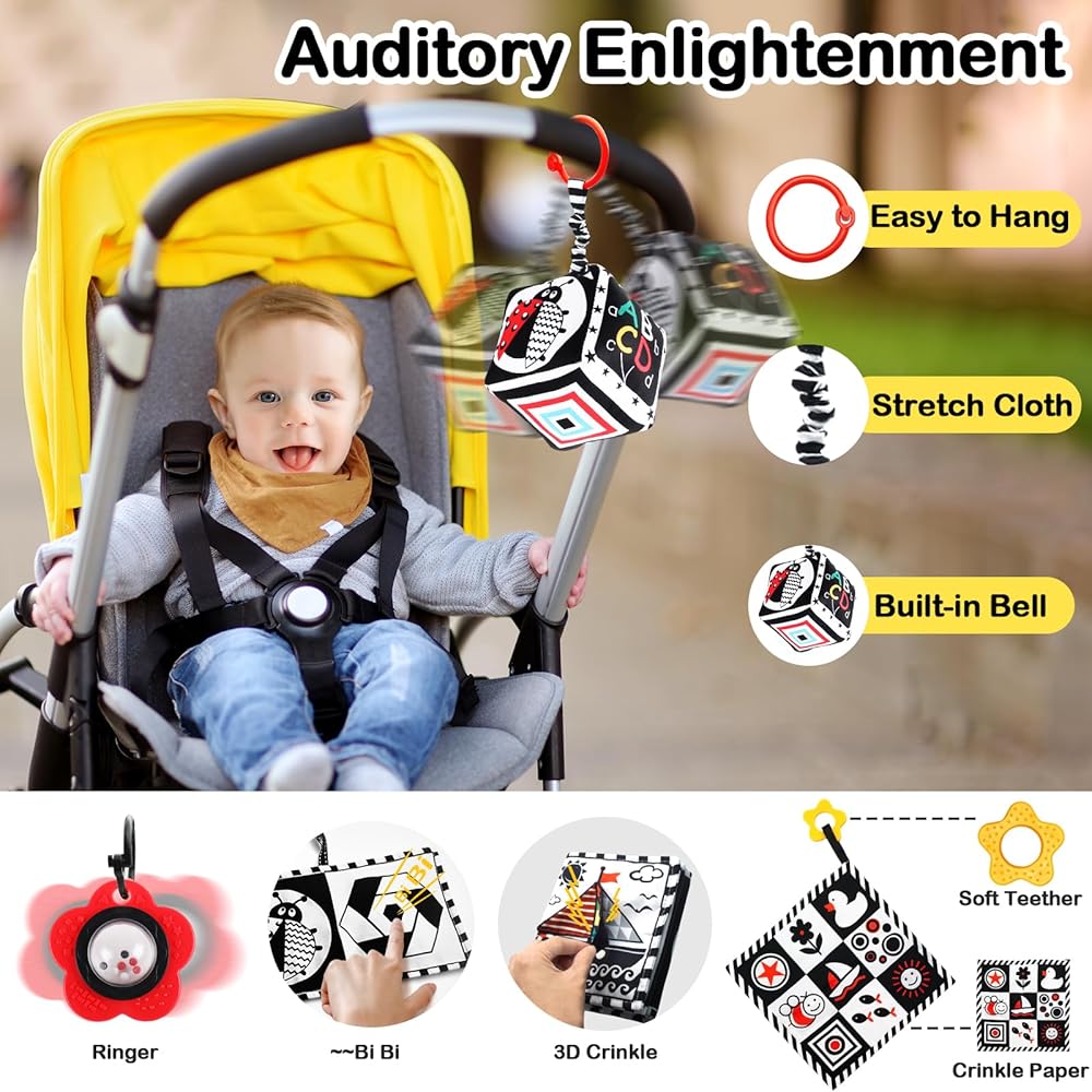 ToyUnited 4 قطع ألعاب أطفال من عمر 0 إلى 3 أشهر، ألعاب حديثي الولادة باللونين الأبيض والأسود عالية التباين لتطوير الدماغ، ألعاب وقت البطن، ألعاب مونتيسوري للأطفال ألعاب كتاب مجعدة حسية ناعمة من عمر 6 إلى 12 شهرًا