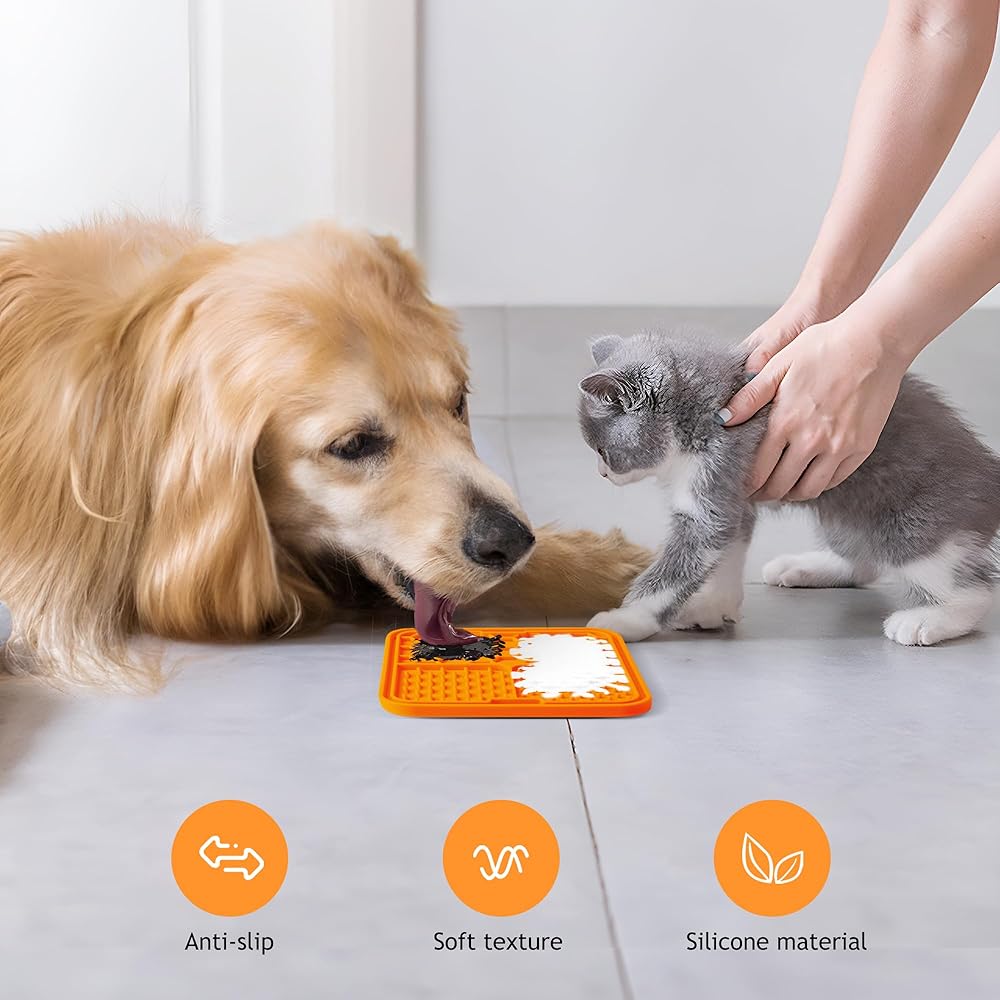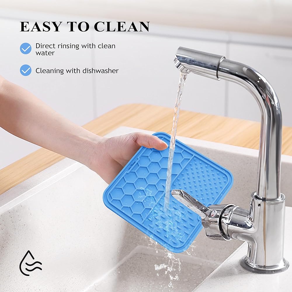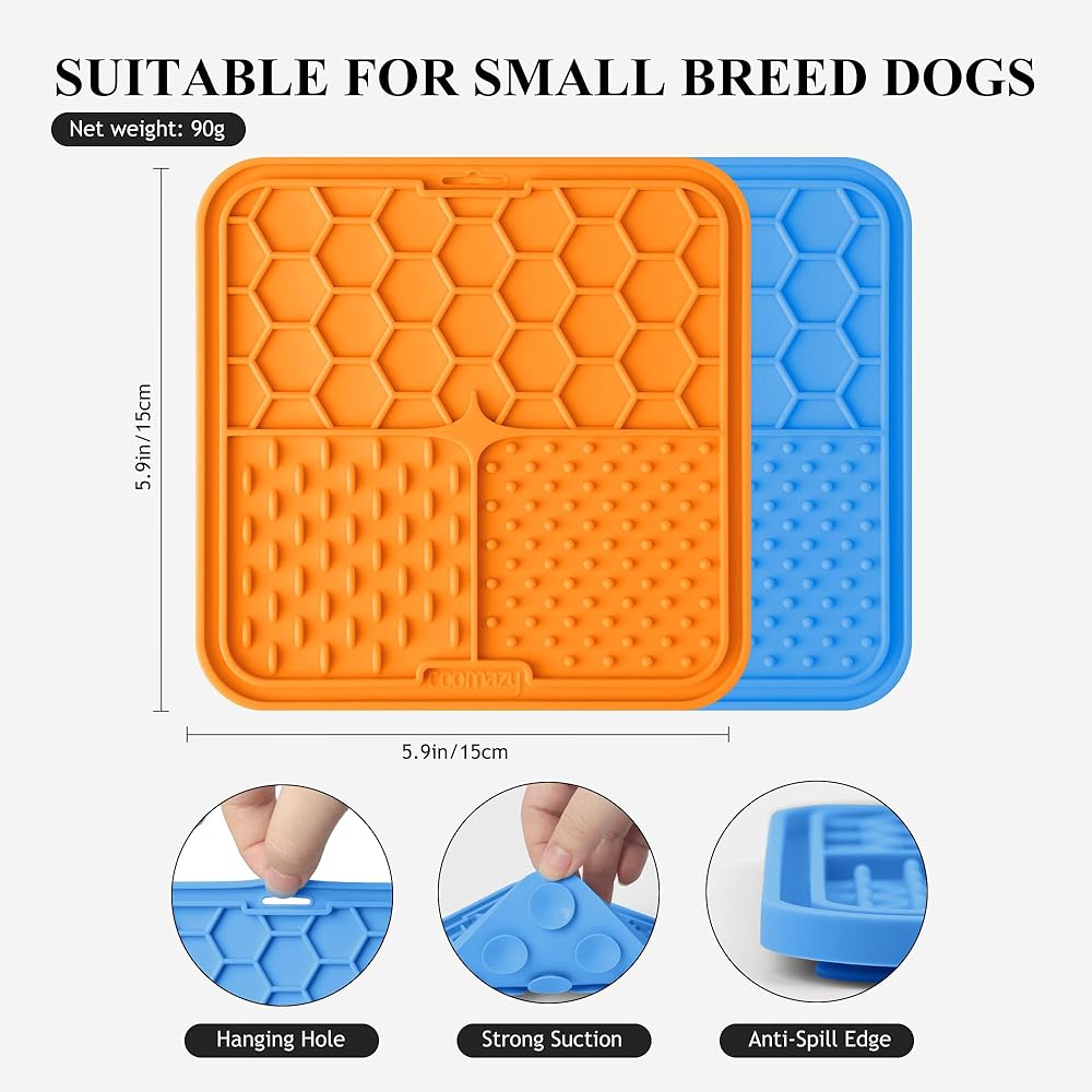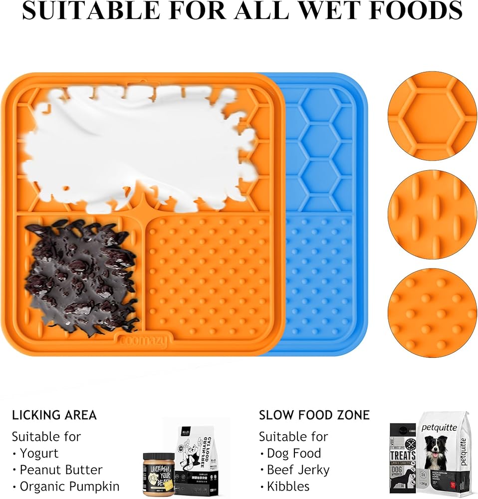 【تأخير الأكل وتصميم الملمس】---حصيرة التغذية البطيئة بثلاثة تصميمات نسيجية تعمل على إطالة وقت تناول الطعام للكلب بشكل فعال وتمنع الكلب من الانتفاخ. تصميم الملمس أكثر دائرية وآمنة لمنع إصابة الكلاب. ثلاث مناطق للأطعمة المختلفة ، مثل زبدة الفول السوداني، واليقطين، والزبادي، والمكسرات، وغيرها.