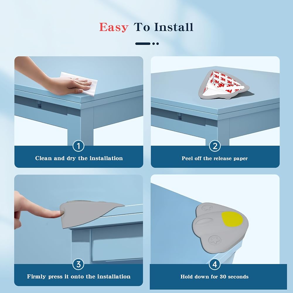👶سهولة التركيب: تتميز واقيات زوايا الأثاث لدينا بخصائص لاصقة ممتازة، مما يضمن ربطًا آمنًا وطويل الأمد بقطع الأثاث المختلفة. عملية التثبيت سهلة - ما عليك سوى إزالة الشريط الخلفي ووضع الواقيات بإحكام على الزوايا المرغوبة. لا توجد أدوات إضافية أو خطوات معقدة مطلوبة.