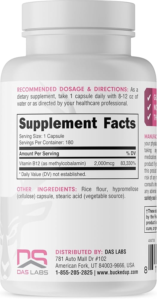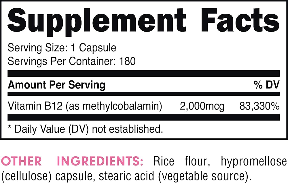 المحتوى والكمية: تحتوي كل زجاجة على 180 كبسولة، حيث توفر كل كبسولة 2000 ميكروغرام من فيتامين ب 12 على شكل ميثيل كوبالامين، أي ما يصل إلى 180 حصة.