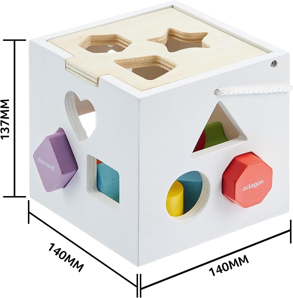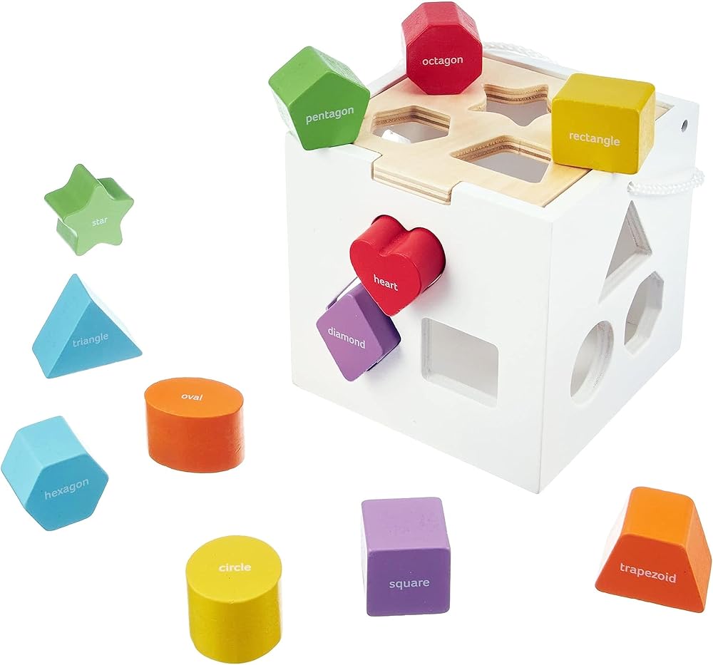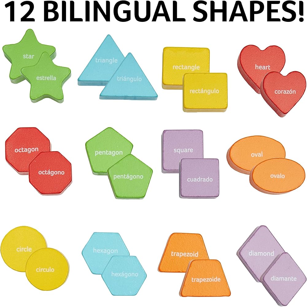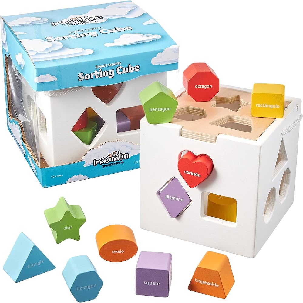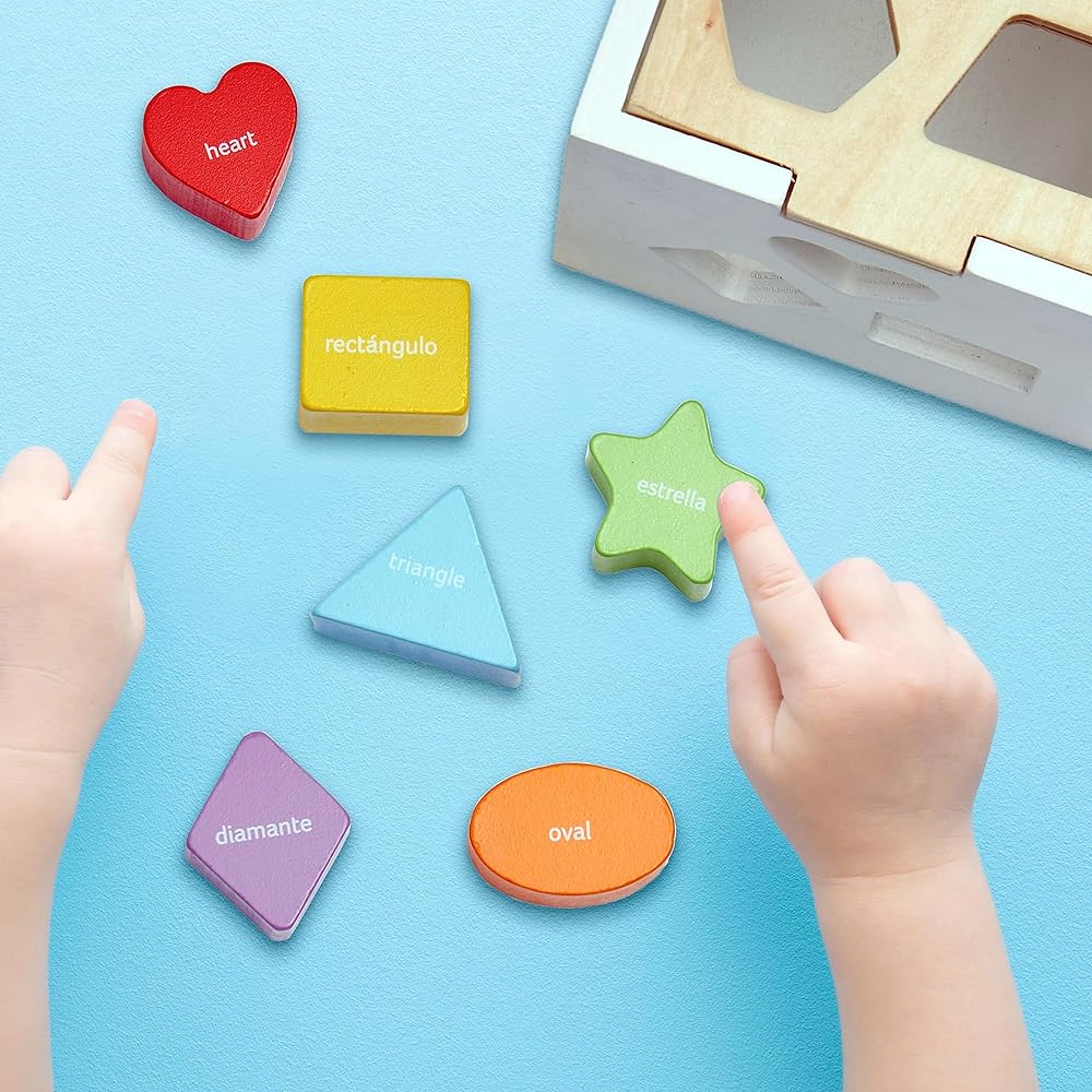 Remember the simple shape sorter from your childhood? This has the same classic concept, but with even more learning opportunity than ever before. The difference? You can now learn the names of the shapes in English AND Spanish all in one box. The names of each shape are written directly on the block. Then -you know the rest- match it to the correct hole on the included sorting cube!