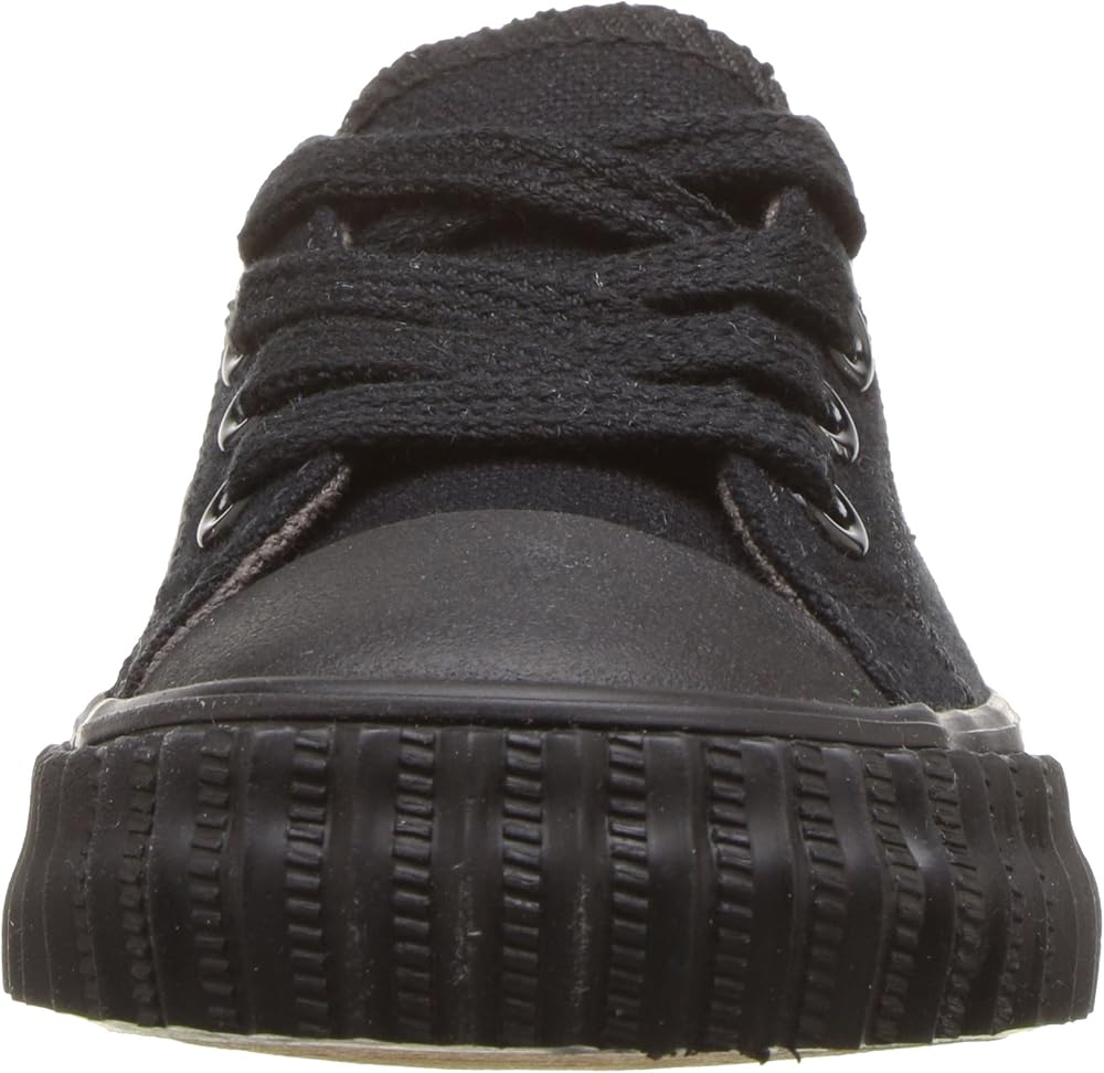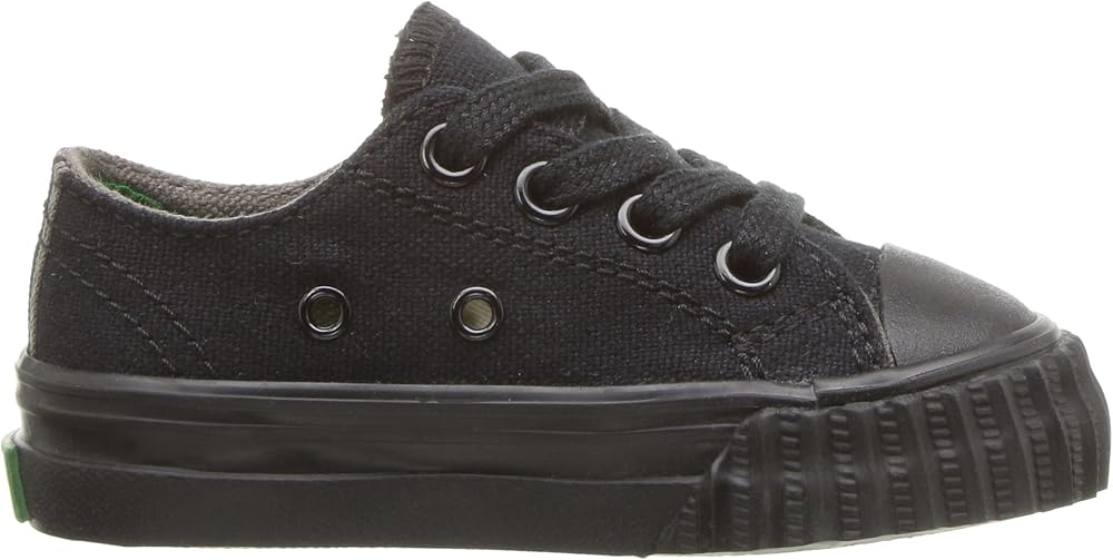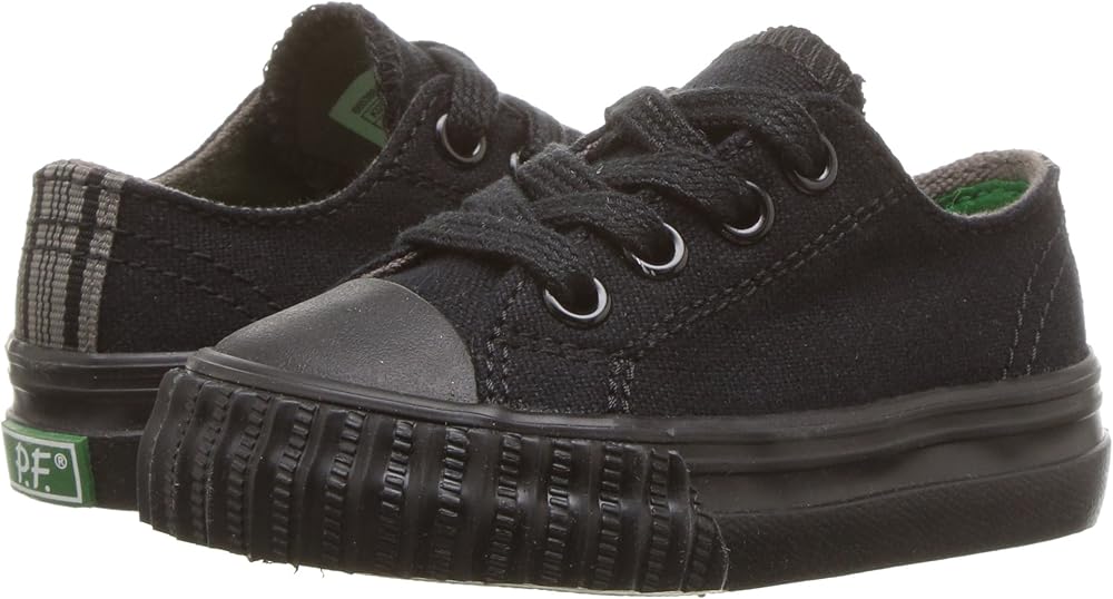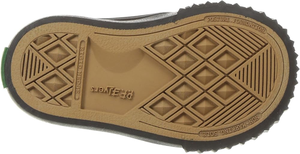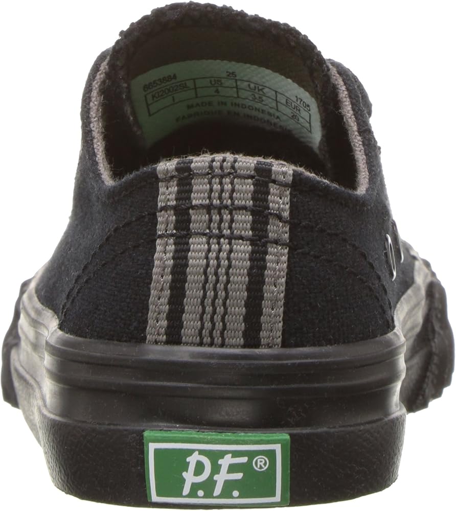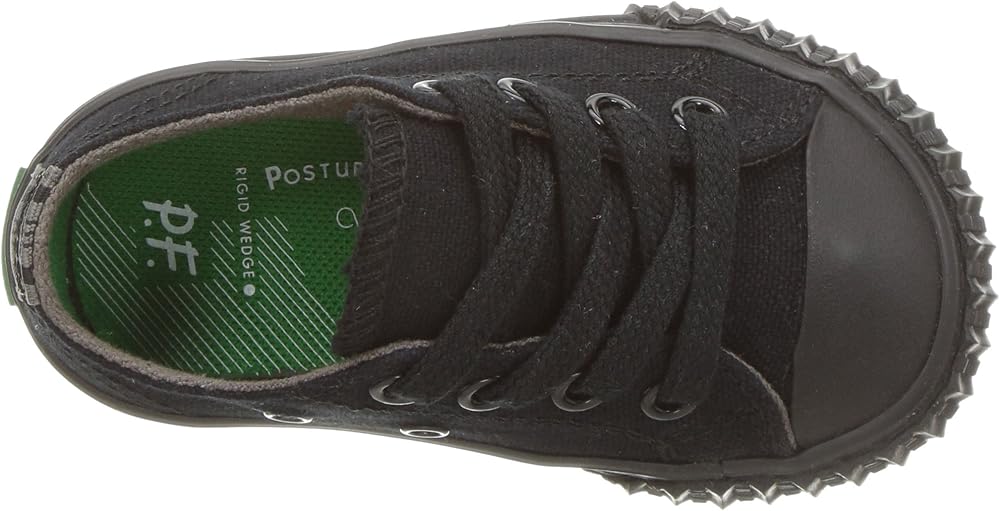Strap them into a sporty classic with the PF Flyers Center Lo. Durable canvas upper. Adjustable lace-up closure. Contrast stitch details on the upper. Rubber toe cap and midsole, and vertical ribbed toe guard. Pop color midsole stripes. Canvas lining and a genuine Posture Foundation insole for all-day comfort. Rigid wedge for added comfort. Vulcanized construction. Durable rubber outsole for traction. Imported.