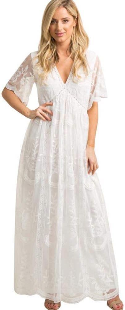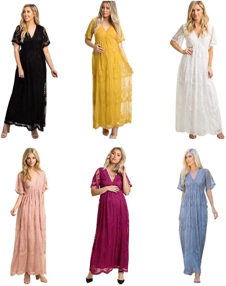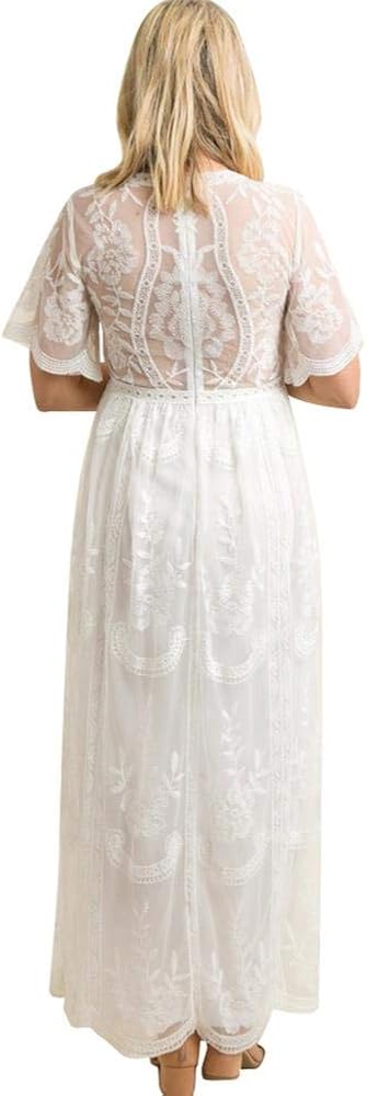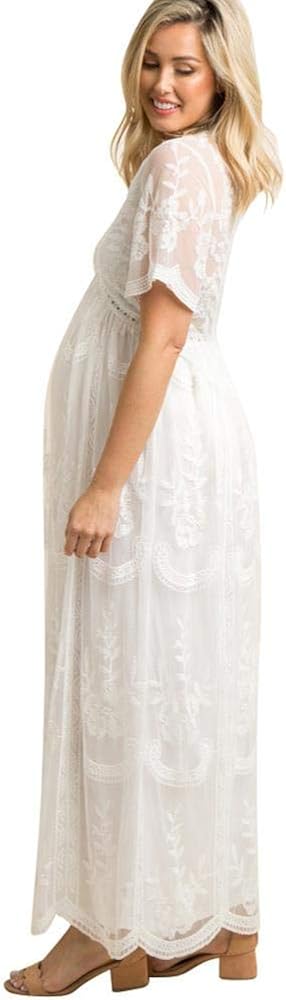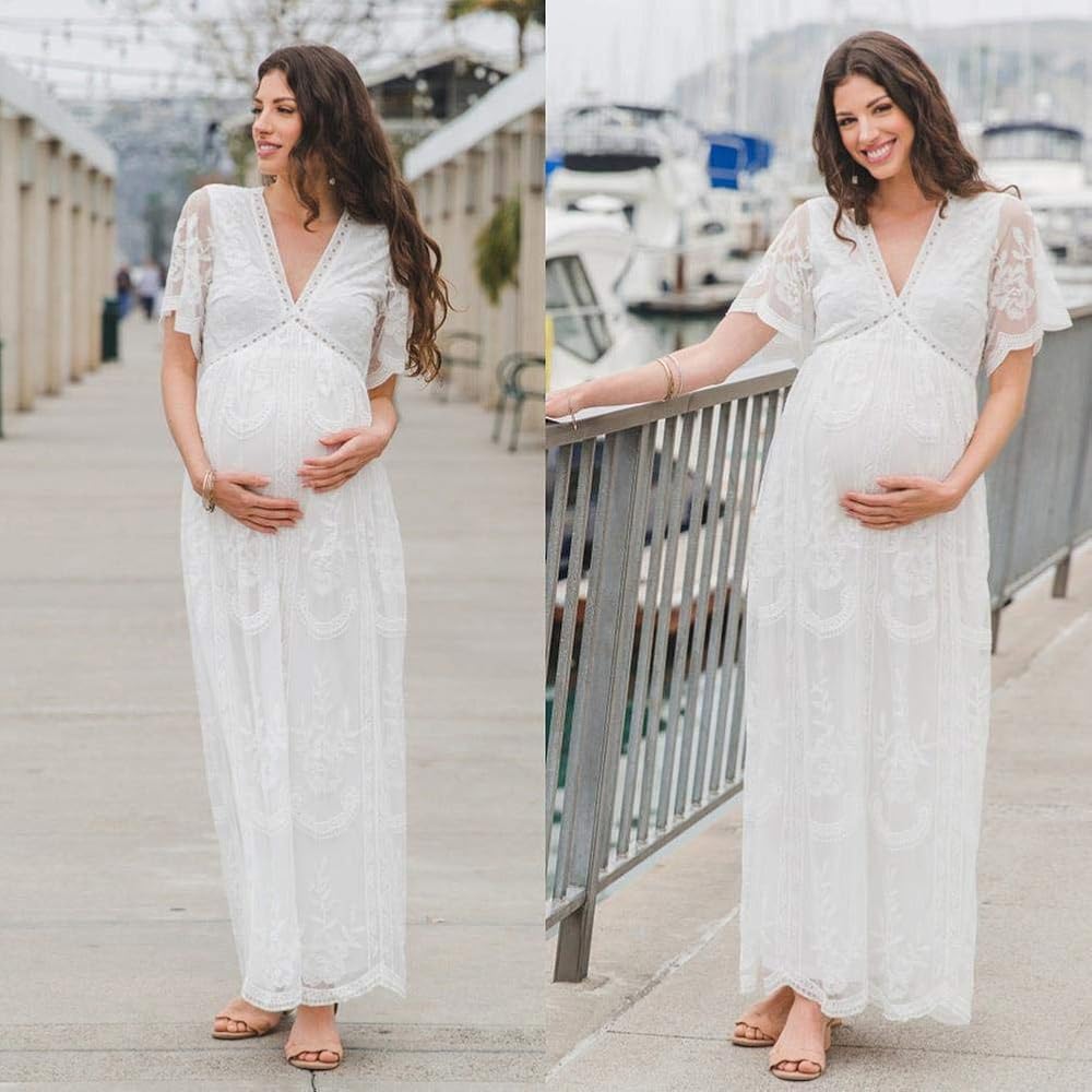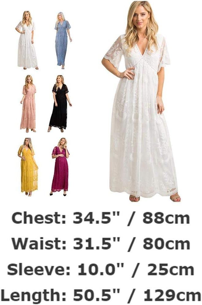 فستان نسائي طويل بياقة على شكل V للسهرات والحمل كاجوال بأكمام قصيرة من الدانتيل بوهو لحفلات الزفاف وحفلات الكوكتيل بطول الأرض فستان طويل للصيف والحمل وحفلات استقبال المولود الجديد للتصوير الفوتوغرافي باللون الأبيض