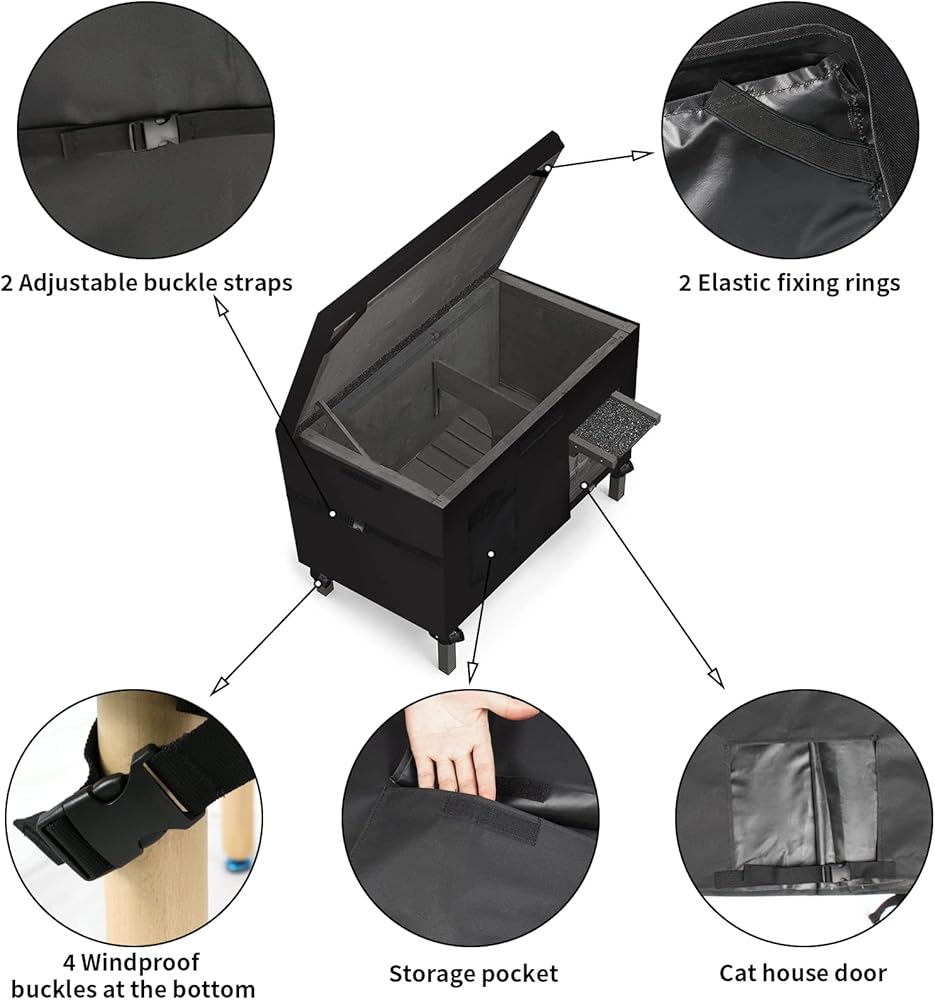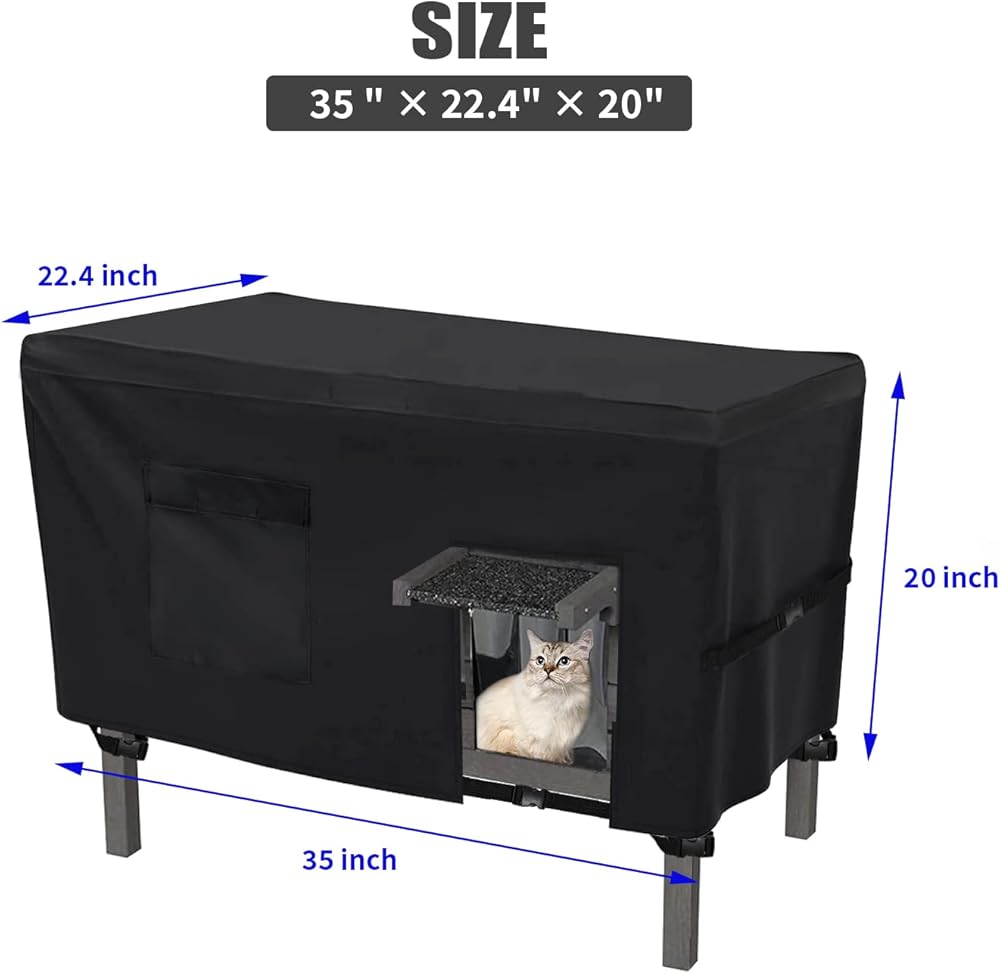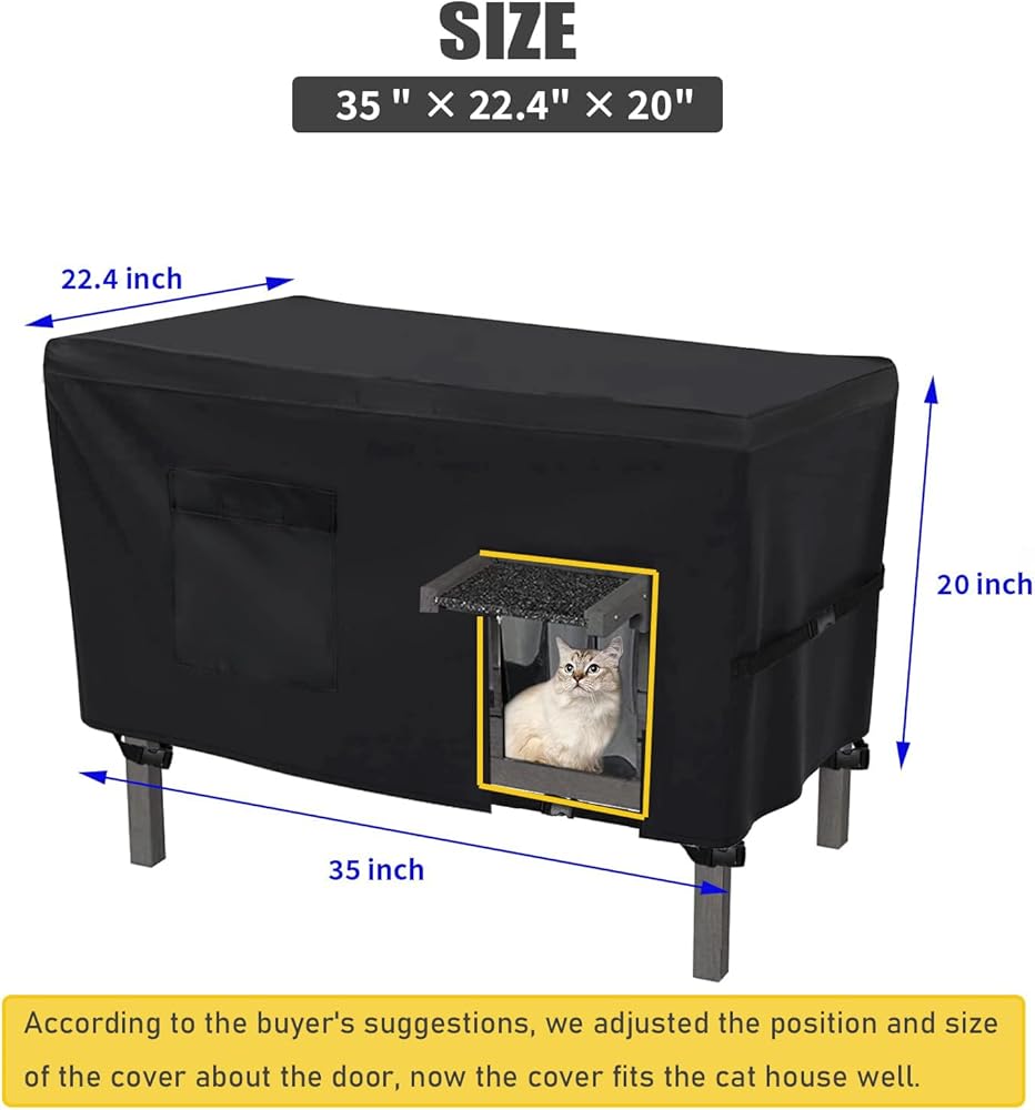 🏚تصميم فريد: تم تصميم الجزء العلوي من غطاء بيت القطط المعزول الخارجي بثلاث فتحات جانبية يمكن إغلاقها. الإبزيم الجانبي يجعل الغطاء أكثر ملاءمة لبيت القطط. يوجد أيضًا فتحة عند فتحة القطط لدخول القطط والخروج منها. يوجد أيضًا جيب مناسب في الأمام للأغراض الأخرى. حجم غطاء بيت القطط هو 35x22.4x20 بوصة.