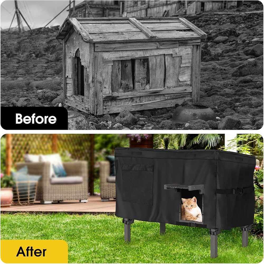 🏚مادة متينة: غطاء بيت القطط الوحشي مصنوع من قماش أكسفورد المتين المقاوم للماء بدرجة 600D لحماية بيت القطط من الشمس. ويمكنه أيضًا حماية بيت القطط الشتوي بشكل فعال في الأيام الممطرة، بحيث تتمتع القطة بمنزل دافئ ومريح. لقد قمنا بتصحيح المشكلات التي أبلغ عنها العملاء على الفور. يرجى الاطمئنان على منتجاتنا