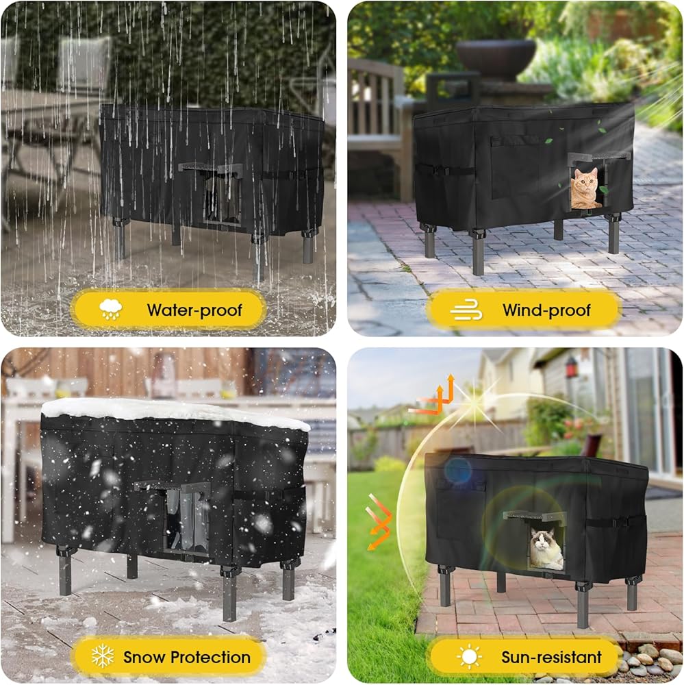🏚 مقاوم للرياح: يوجد 4 مشابك مقاومة للرياح في الجزء السفلي من غطاء بيت القطط، والتي يمكن أن تمنع الغطاء من أن يتطاير بسبب الرياح القوية.