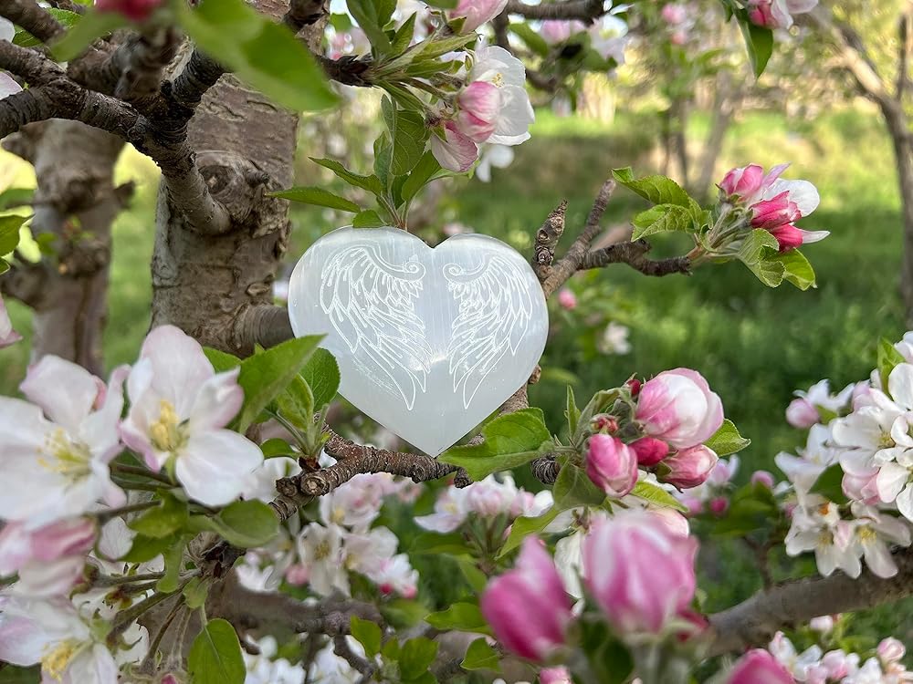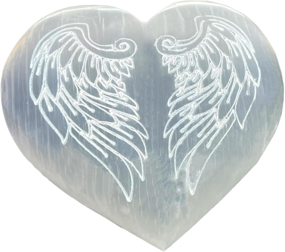 أجنحة ملاك القلب المنقوشة من Xen Minerals Selenite - قلوب وأحجار كريستالية أصلية للشفاء وتوازن الشاكرا، بلورات وصخور على شكل قلب، أحجار كريمة بيضاء شفافة صغيرة مقاس 7.62 سم ​​هالة صحية هادئة