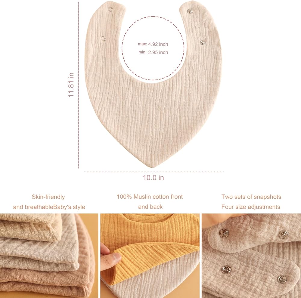 مجموعة من 6: تحتوي كل مجموعة على 6 مرايل من الموسلين، وصدريات منديل لطيفة، و6 عبوات يمكن تغييرها بحرية لتلبية احتياجاتك اليومية، كما أنها سهلة الغسيل والتجفيف بسرعة. مع زرين كبس قابلين للتعديل وخاليين من النيكل، مناسب للأطفال من سن 0 إلى 36 شهرًا.