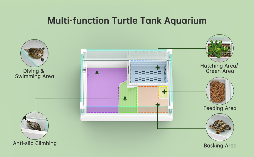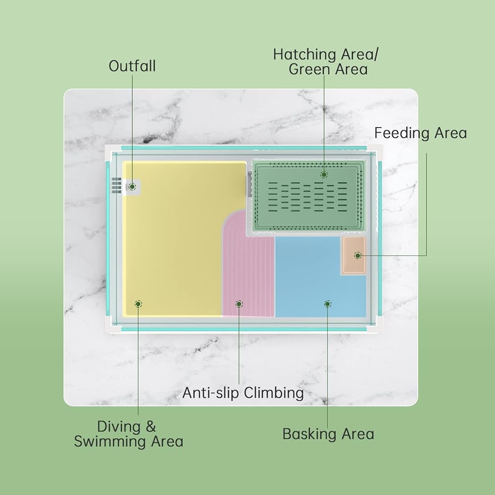 【مساحة لعب صغيرة لطيفة لسلحفاة طفلك】تم تصميم حوض أسماك السلحفاة بخمس مناطق - منصة تشمس، ومنطقة تسلق مضادة للانزلاق، ومنطقة سبات التكاثر، ومنطقة السباحة، كما يحتوي على محطة تغذية منفصلة هي خيار جيد لتجنب الاضطرار إلى ذلك. تنظيف الخزان الرئيسي في كثير من الأحيان. مساحة كبيرة للسلحفاة الصغيرة لتناول الطعام والاستلقاء والاستكشاف والسباحة. مجموعة بداية مثالية لسلحفاة صغيرة!