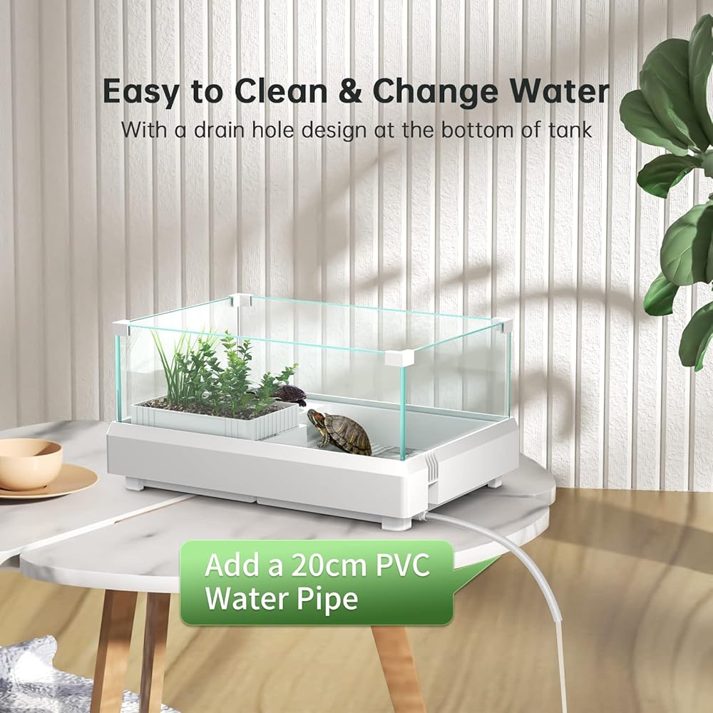 [مادة ممتازة] الجزء السفلي من الخزان مصنوع من مادة أكريلونتريل بوتادين ستايرين، غير سامة، غير مهيجة، آمنة، قوية وغير قابلة للتشوه عند الاستخدام. امنح سلاحفك بيئة مريحة وصحية. كما أن تصميم الصرف السفلي يسهل تغيير الماء، مما يوفر وقتك، كما أنه يوفر أنبوب تصريف من البولي فينيل كلوريد مقاس 20 سم، وهو مريح للغاية.