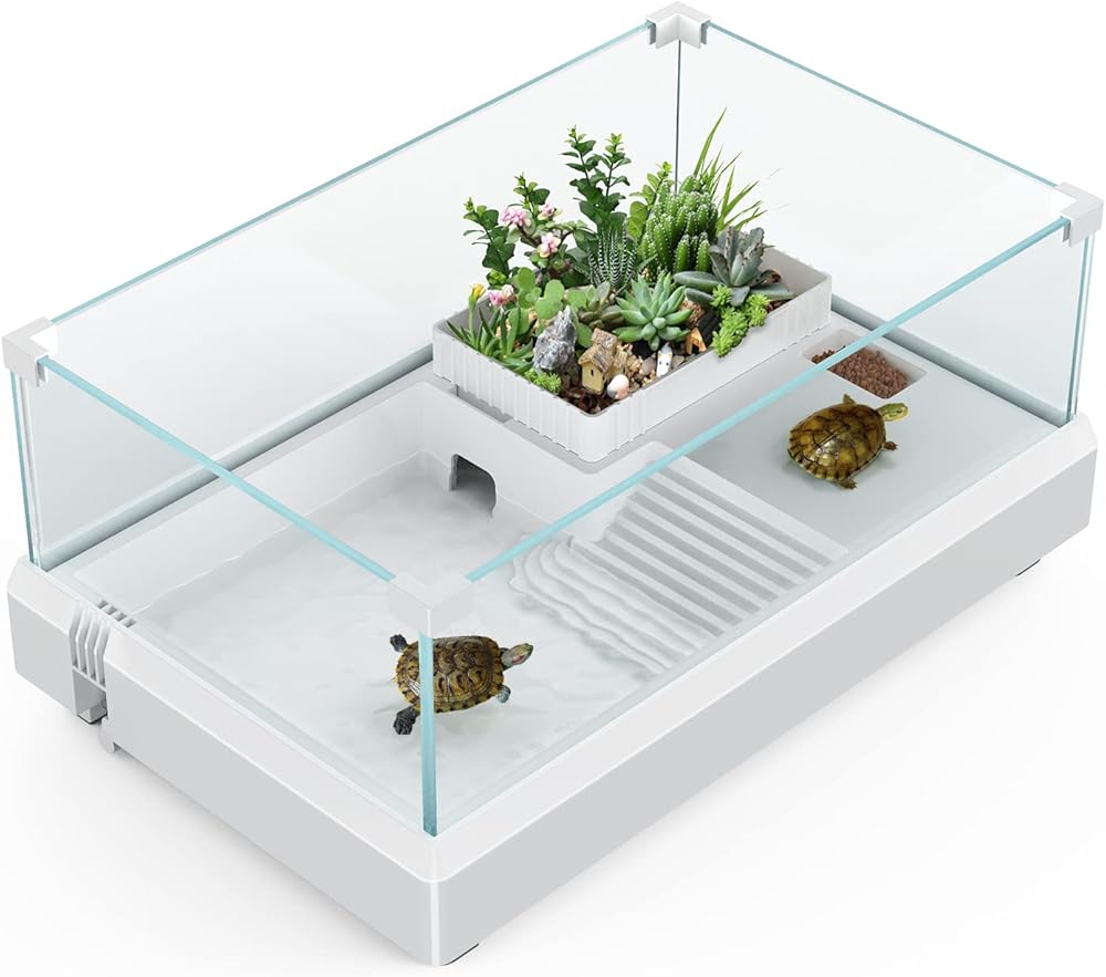 حوض السمك الزجاجي لخزان السلاحف، تررم موطن السلاحف من SILICAR مع منصة تشمس، تصميم تصريف سفلي، منطقة متعددة الوظائف رائعة لسرطان البحر الناسك، التيرابين والزواحف الصغيرة