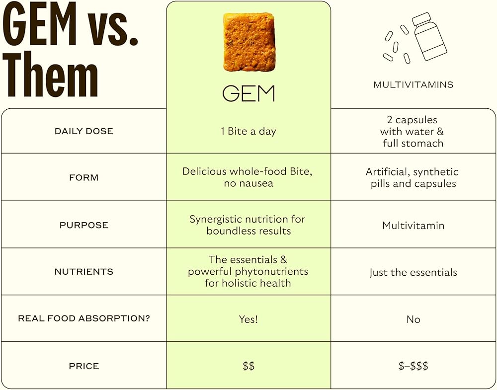 • ماذا: يمتص جسمك العناصر الغذائية من الطعام بشكل أفضل بكثير من الحبوب والمساحيق المعزولة. تعمل الفيتامينات والمواد المغذية الموجودة في GEM بشكل تآزري لتحقيق نتائج لا حدود لها. بالإضافة إلى ذلك، لا داعي للقلق بشأن تناول لقيمتك على معدة فارغة! الطعام الحقيقي ليس مقرفاً