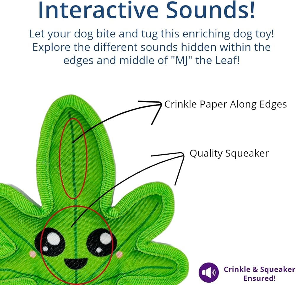 💥𝗦𝗾𝘂𝗲𝗮𝗸𝘆 & 𝗖𝗿𝗶𝗻𝗸𝗹𝘆: "MJ" the leaf is known to be pretty "loud"! Enjoy "MJ's" interactive built-in squeaker within the middle and spread towards the crinkle paper filled ends for an all around diverse and enriching doggie playtime.