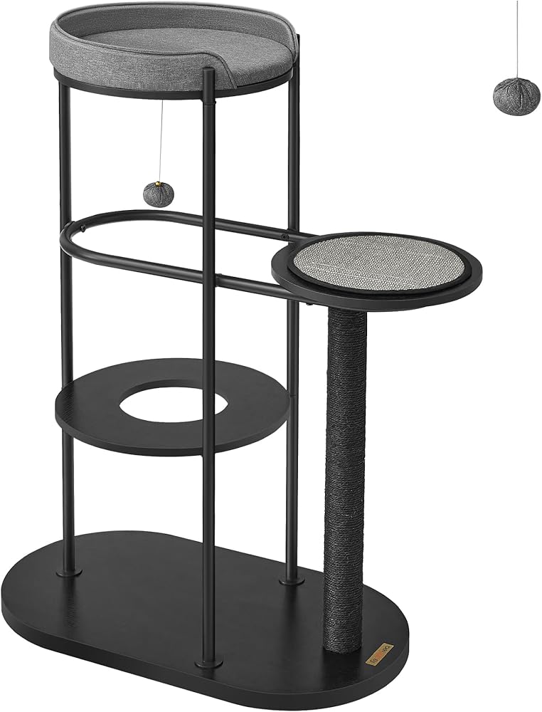 فياندريا شجرة قطط عصرية، برج قطط، انبوب ستيل ولوح حبيبي، منصة مع وسادة، عمود خدش للقطط من السيزال، كرة معلقة من القطن والكتان، 31 × 17 × 44 انش، اسود كلاسيكي UPCT117B01