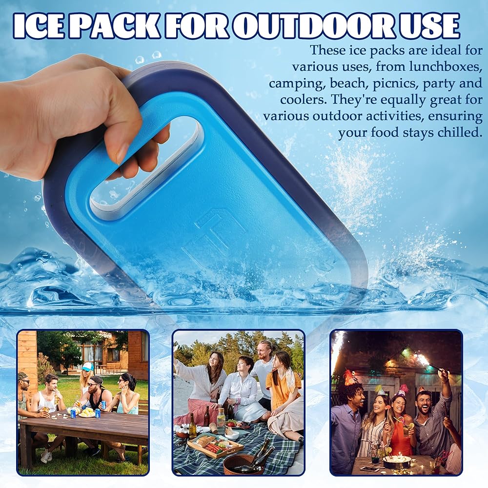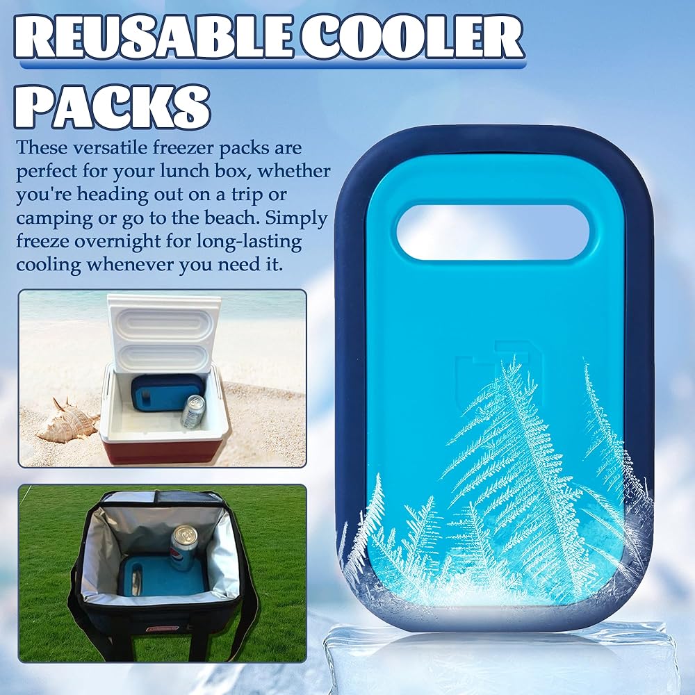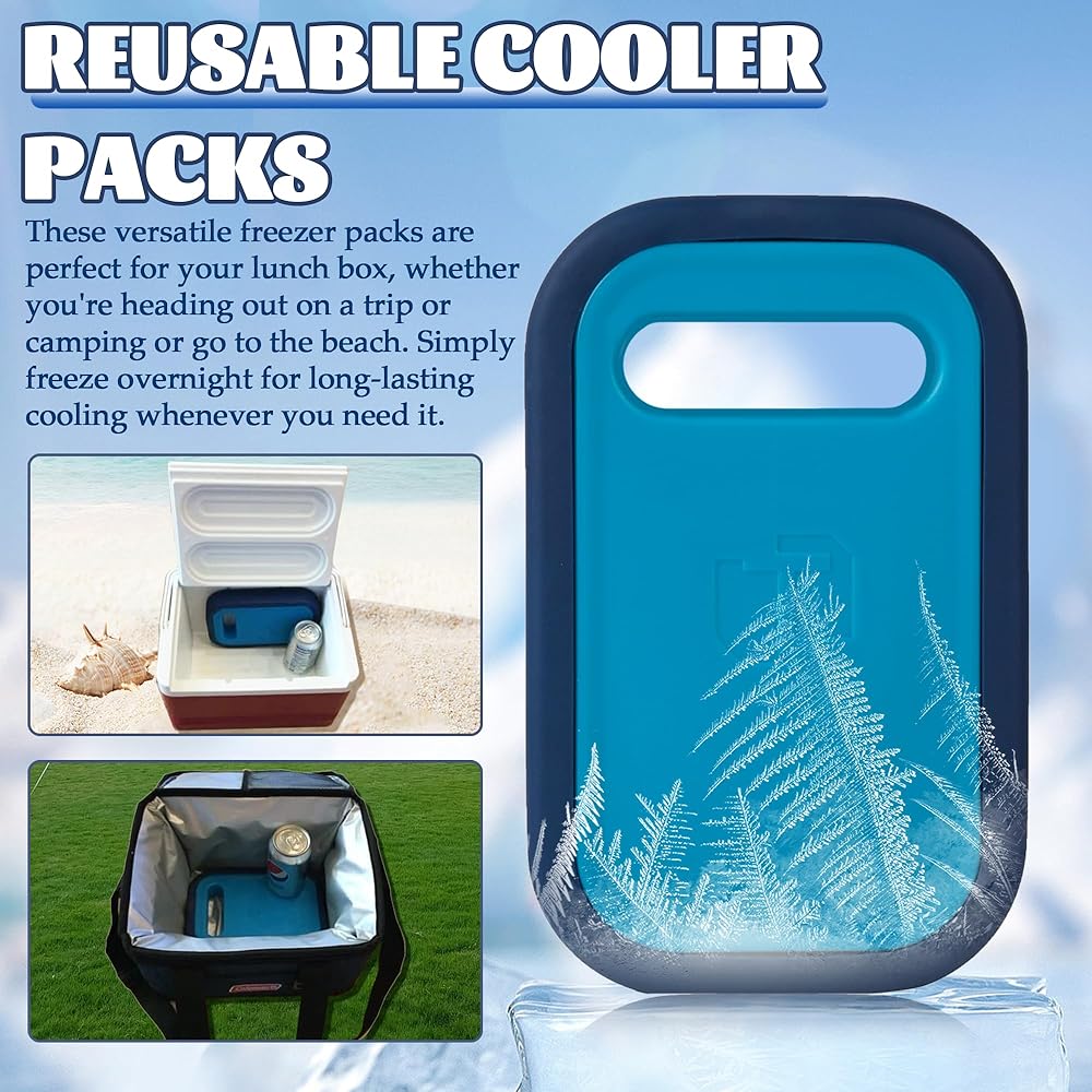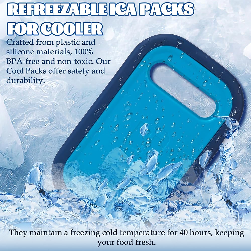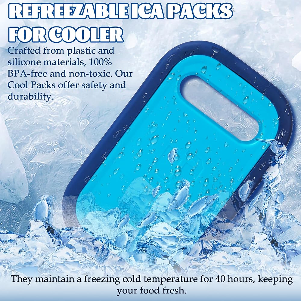 REFREEZABLE ICA PACKS FOR COOLER - Crafted from plastic and silicone materials, 100% BPA-free and non-toxic. Our Cool Packs offer safety and durability. They maintain a freezing cold temperature for 40 hours, keeping your food fresh. LARGE ICE BAGS - This reusable ice packs is measuring 9.05 x 5.66 x 1.57 inches,and these ice packs are designed to keep your insulated cooler bag cold for extended periods. REUSABLE COOLER PACKS - These versatile freezer packs are perfect for your lunch box, whether you're heading out on a trip or camping or go to the beach. Simply freeze overnight for long-lasting cooling whenever you need it. ICE PACK FOR OUTDOOR USE - These ice packs are ideal for various uses, from lunchboxes, camping, beach, picnics, party and coolers. They're equally great for various outdoor activities, ensuring your food stays chilled. MULTI-PURPOSE COOLING - These versatile ice packs are suitable for various occasions, such as keeping lunchboxes cool, ensuring freshness at picnics, hikes, fishing trips, and much more.