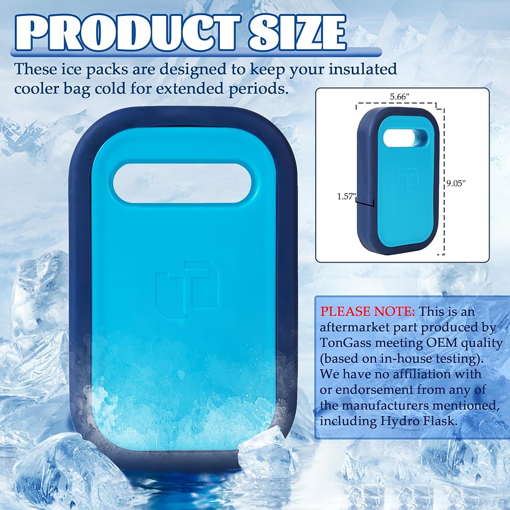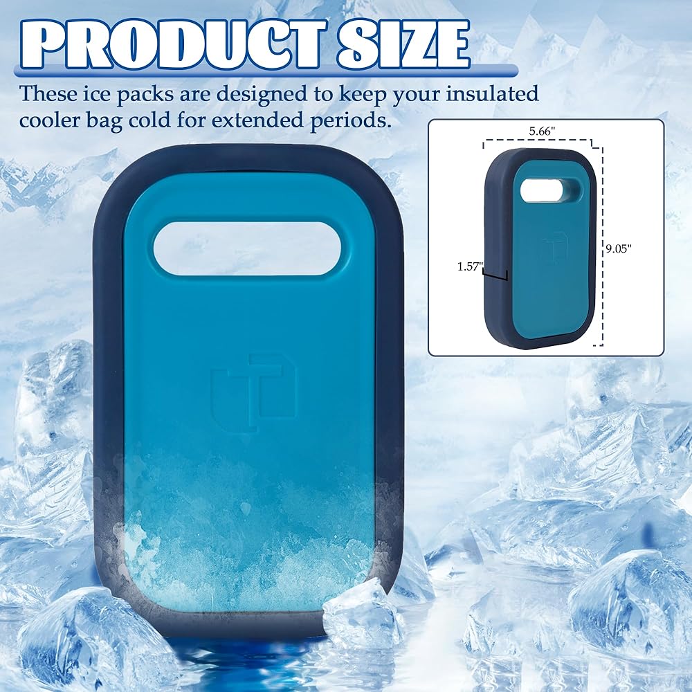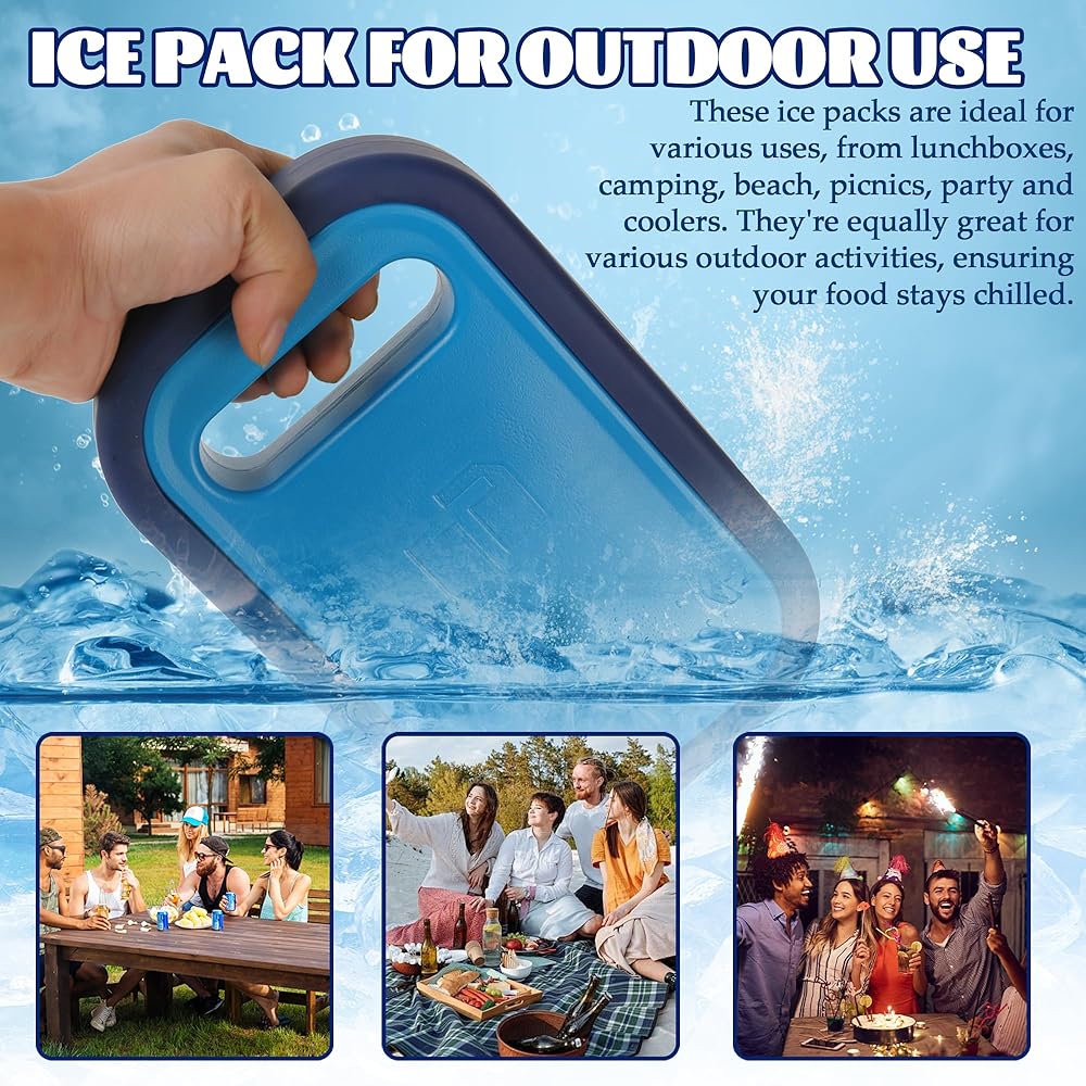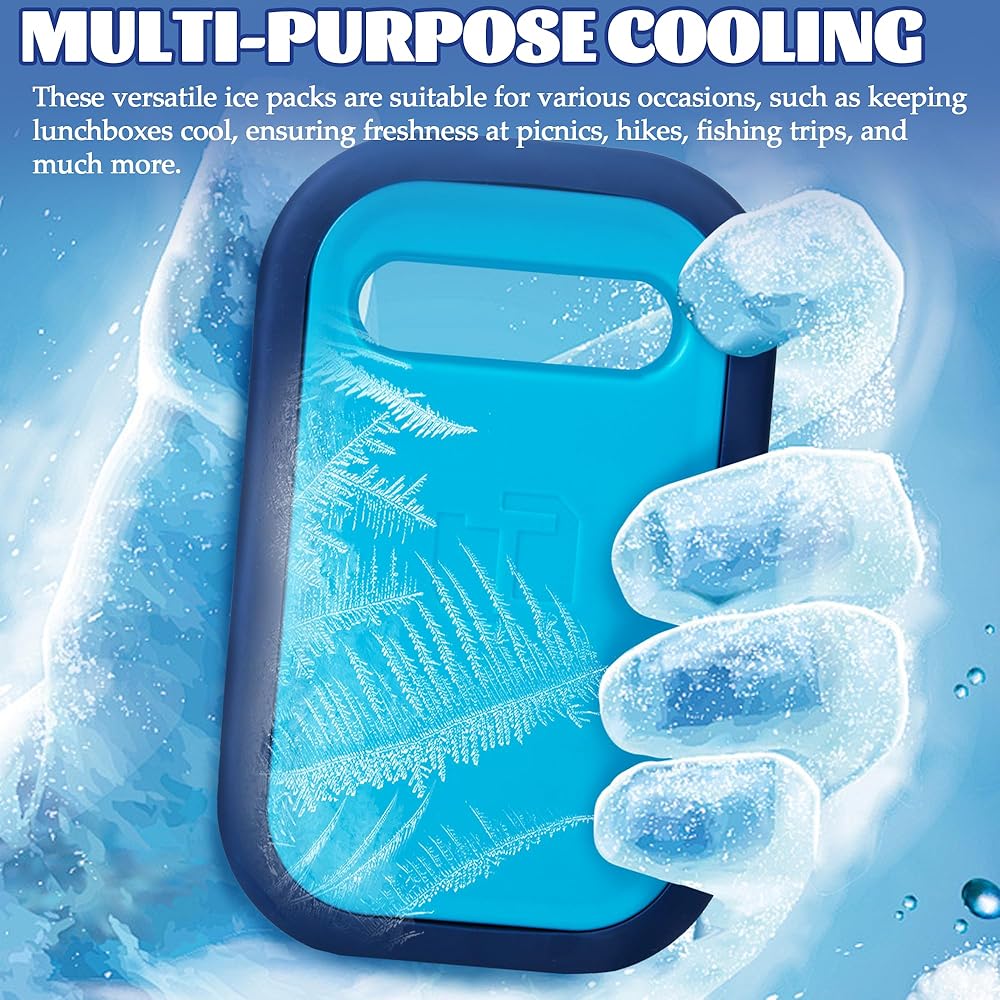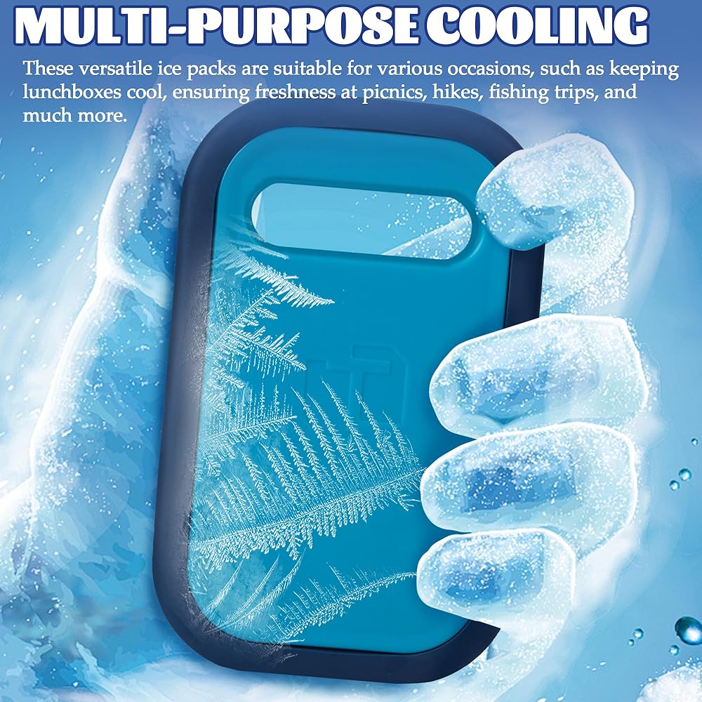 REFREEZABLE ICA PACKS FOR COOLER - Crafted from plastic and silicone materials, 100% BPA-free and non-toxic. Our Cool Packs offer safety and durability. They maintain a freezing cold temperature for 40 hours, keeping your food fresh. LARGE ICE BAGS - This reusable ice packs is measuring 9.05 x 5.66 x 1.57 inches,and these ice packs are designed to keep your insulated cooler bag cold for extended periods. REUSABLE COOLER PACKS - These versatile freezer packs are perfect for your lunch box, whether you're heading out on a trip or camping or go to the beach. Simply freeze overnight for long-lasting cooling whenever you need it. ICE PACK FOR OUTDOOR USE - These ice packs are ideal for various uses, from lunchboxes, camping, beach, picnics, party and coolers. They're equally great for various outdoor activities, ensuring your food stays chilled. MULTI-PURPOSE COOLING - These versatile ice packs are suitable for various occasions, such as keeping lunchboxes cool, ensuring freshness at picnics, hikes, fishing trips, and much more.
