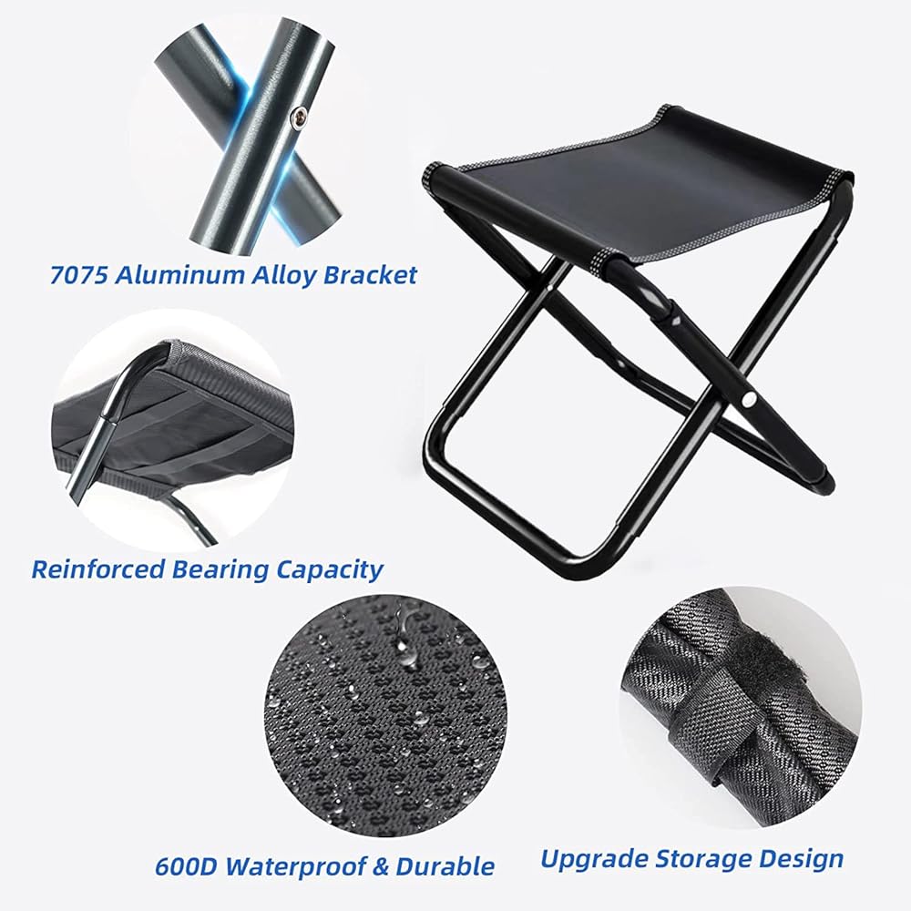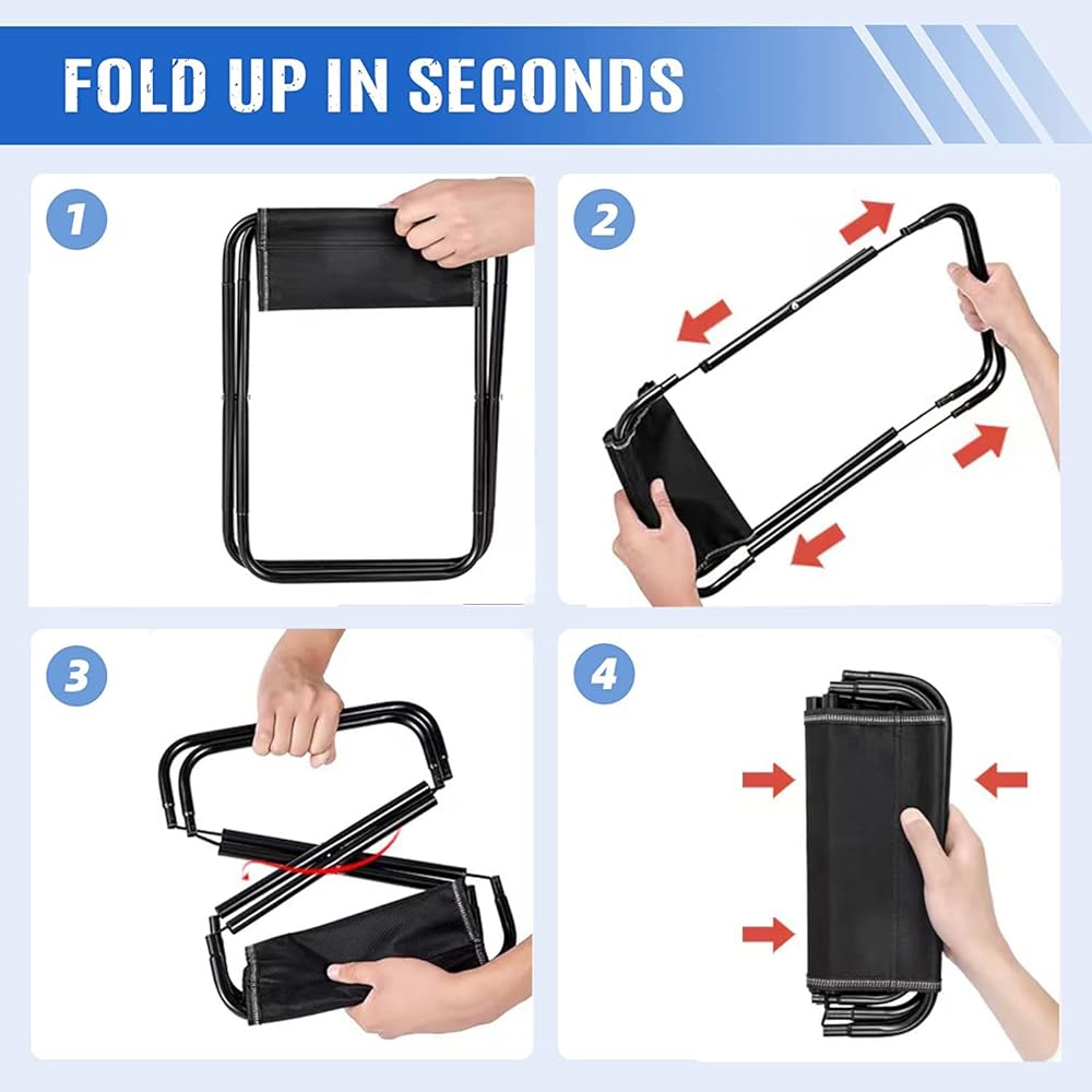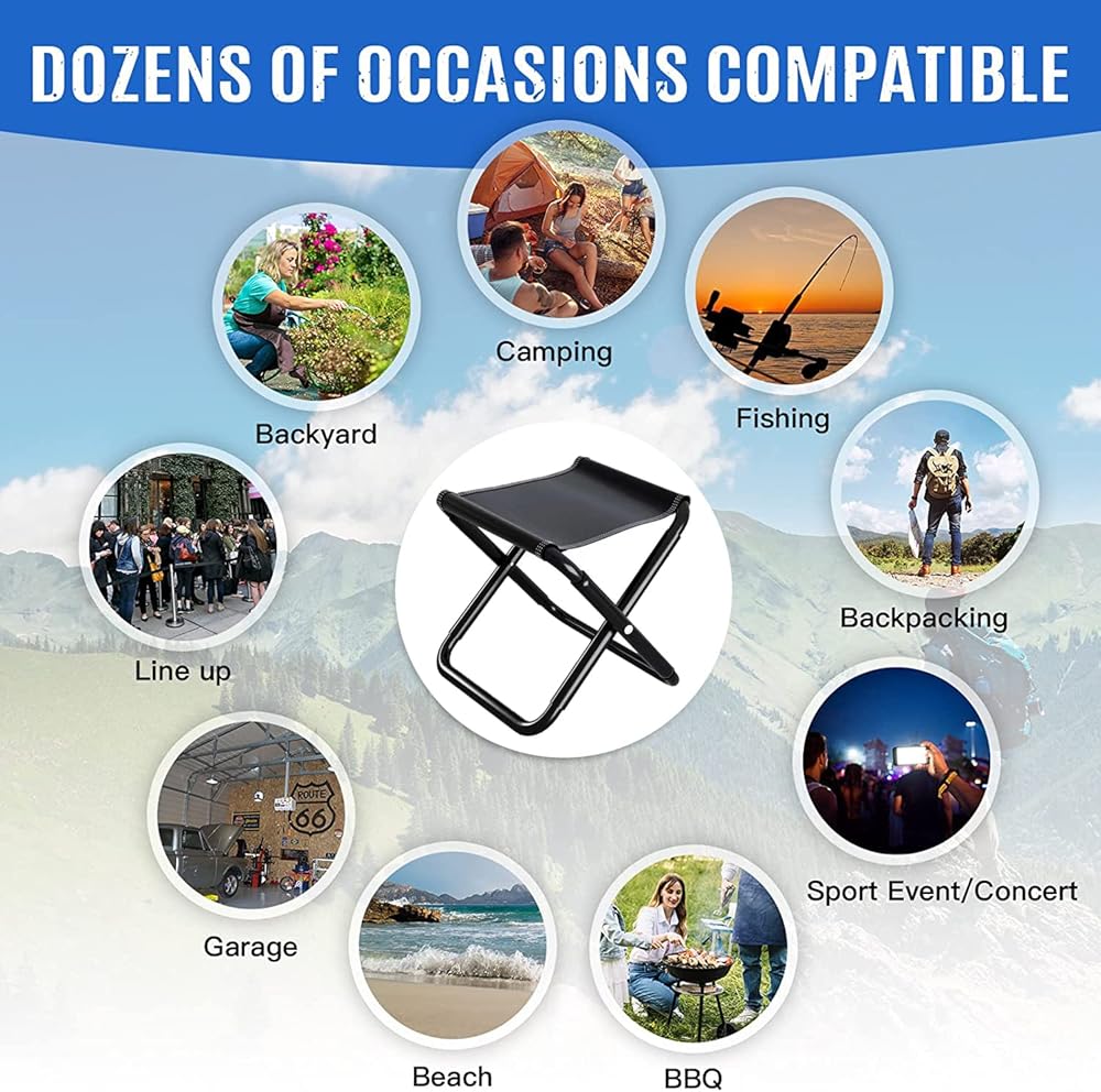 【Folding Camping Stool】- 2 Pack,The height of the camping stool is 12 in, which is comfortable for most people to sit. Come with a storage bag, convenient to put into backpack, portable and practical, The Folding Design and Lightweight make it easy to carry, you can take it to any places you like. It will be your ideal travel companion during Camping, ultralight Hiking, Picnic, Fishing, Travelling, Beach trips and other Outdoor activities.