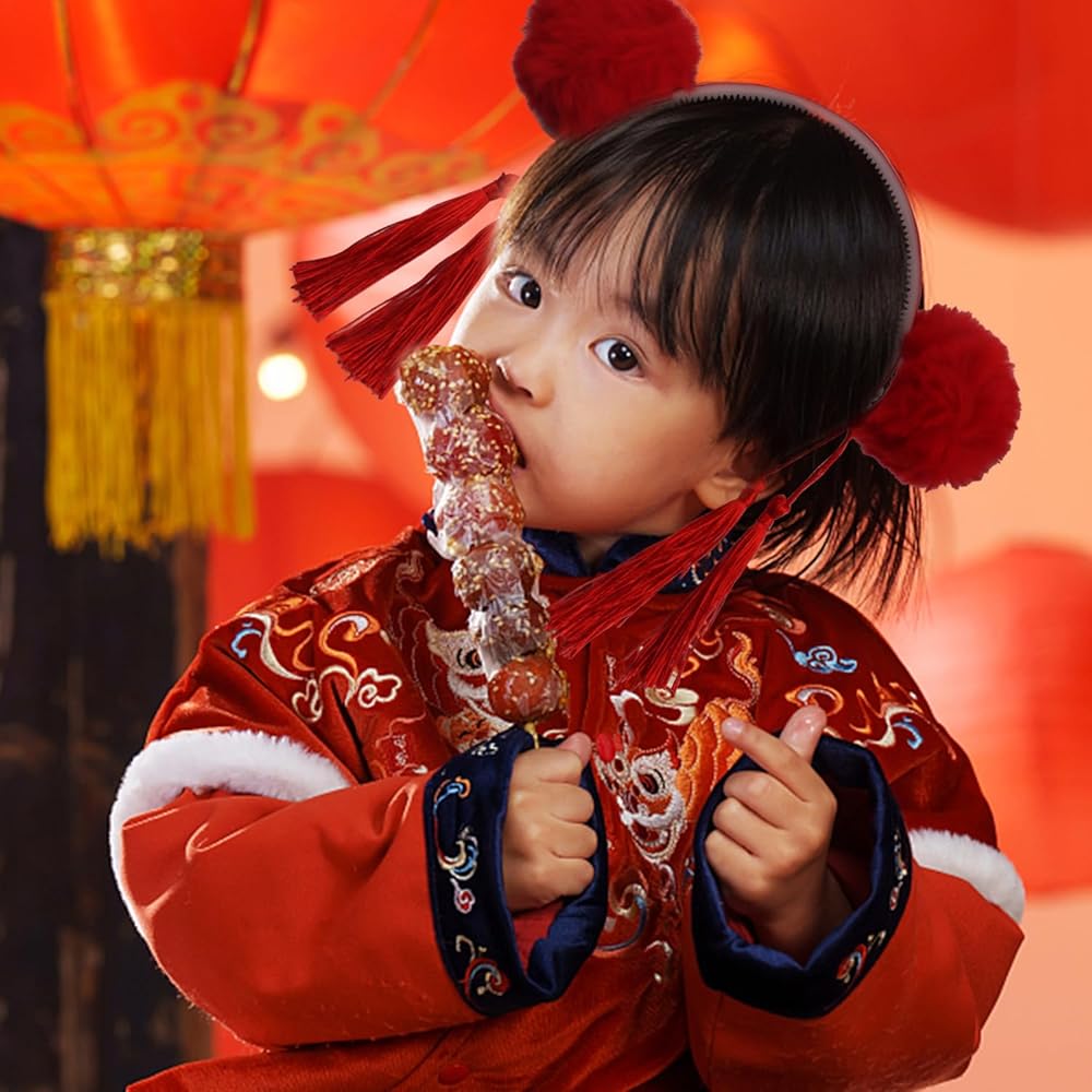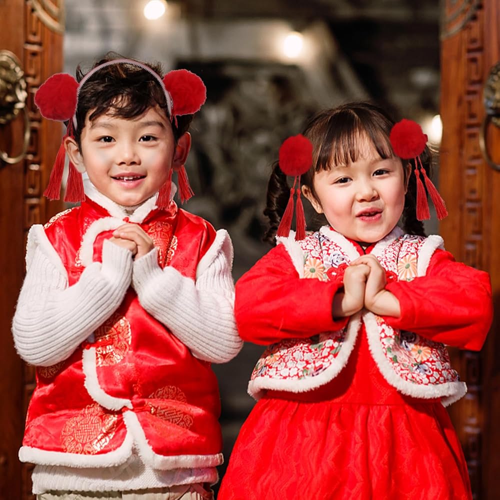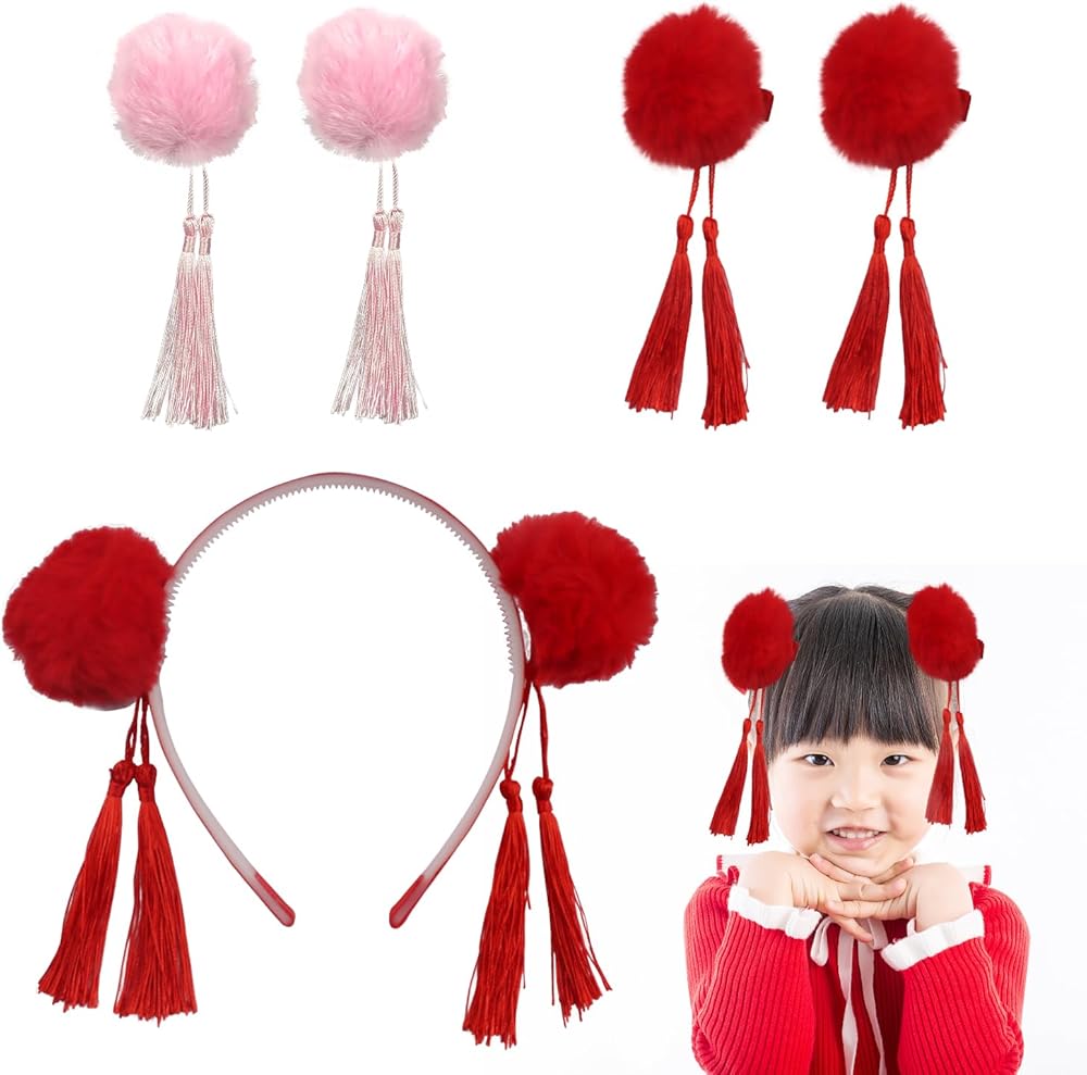 Baby girls hair clips adorned with Chinese-style hairy furry ball bows and tassels, perfect for kids' festivals.