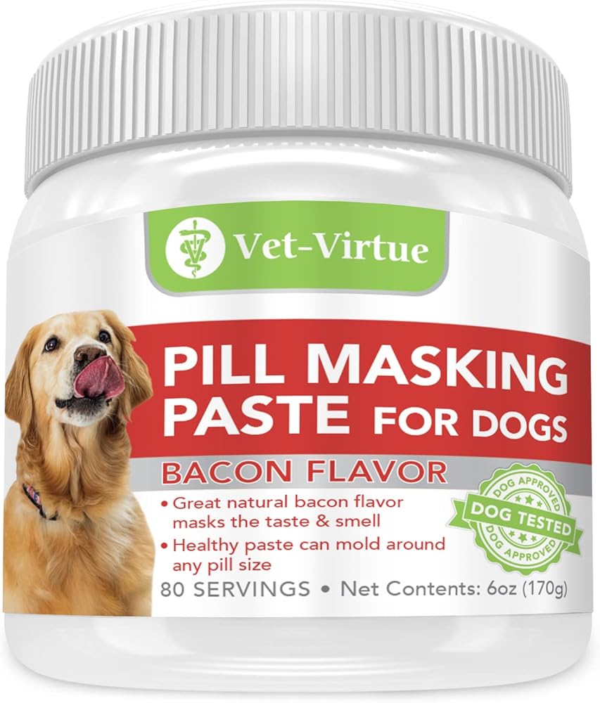 معجون إخفاء حبوب منع الحمل للكلاب من VET-VIRTUE، نكهة لحم الخنزير المقدد - علاجات طبية مثالية للحيوانات الأليفة لإخفاء الحبوب والأدوية والكبسولات، بمكونات طبيعية ومعبأة بالنكهات التي تحبها الكلاب